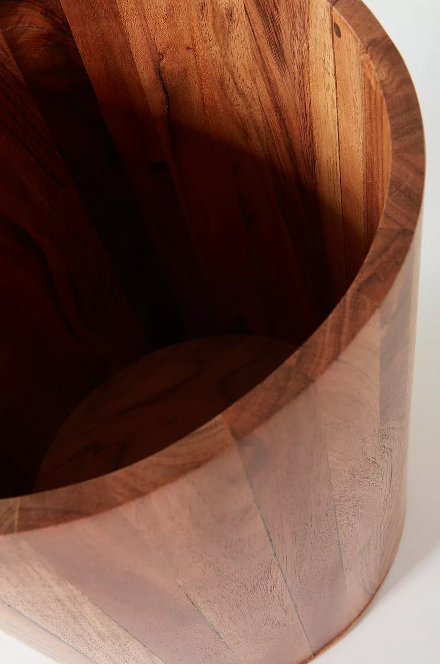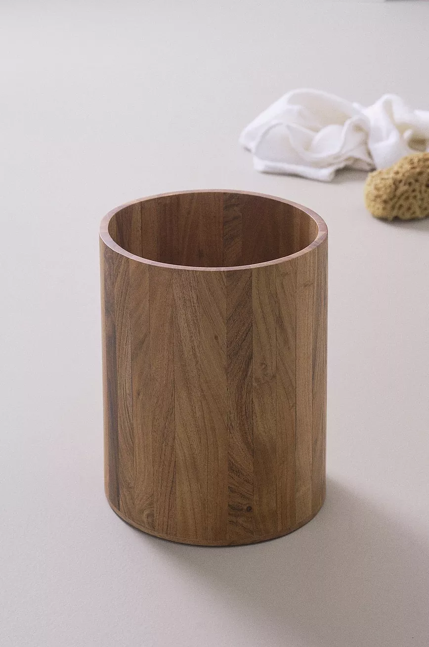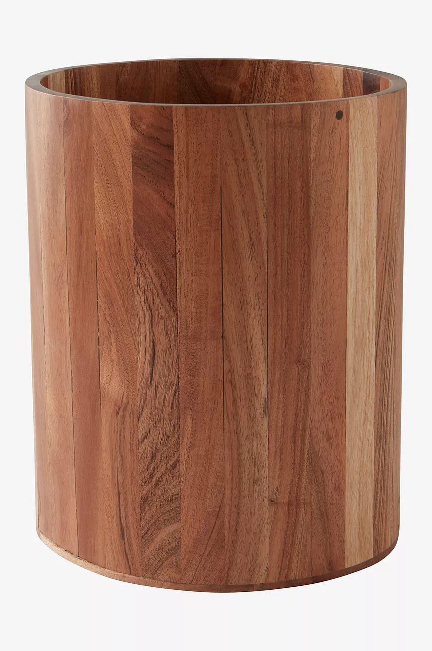Rund papirkurv av akasie, et fint, dyrket treslag med lekker ådring og vakker, litt mørk trefarge. Baderomsserien AKIKO kommer i flere deler som gjør badet koselig og pent.