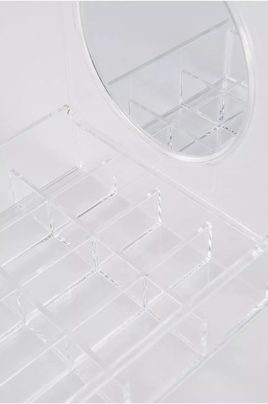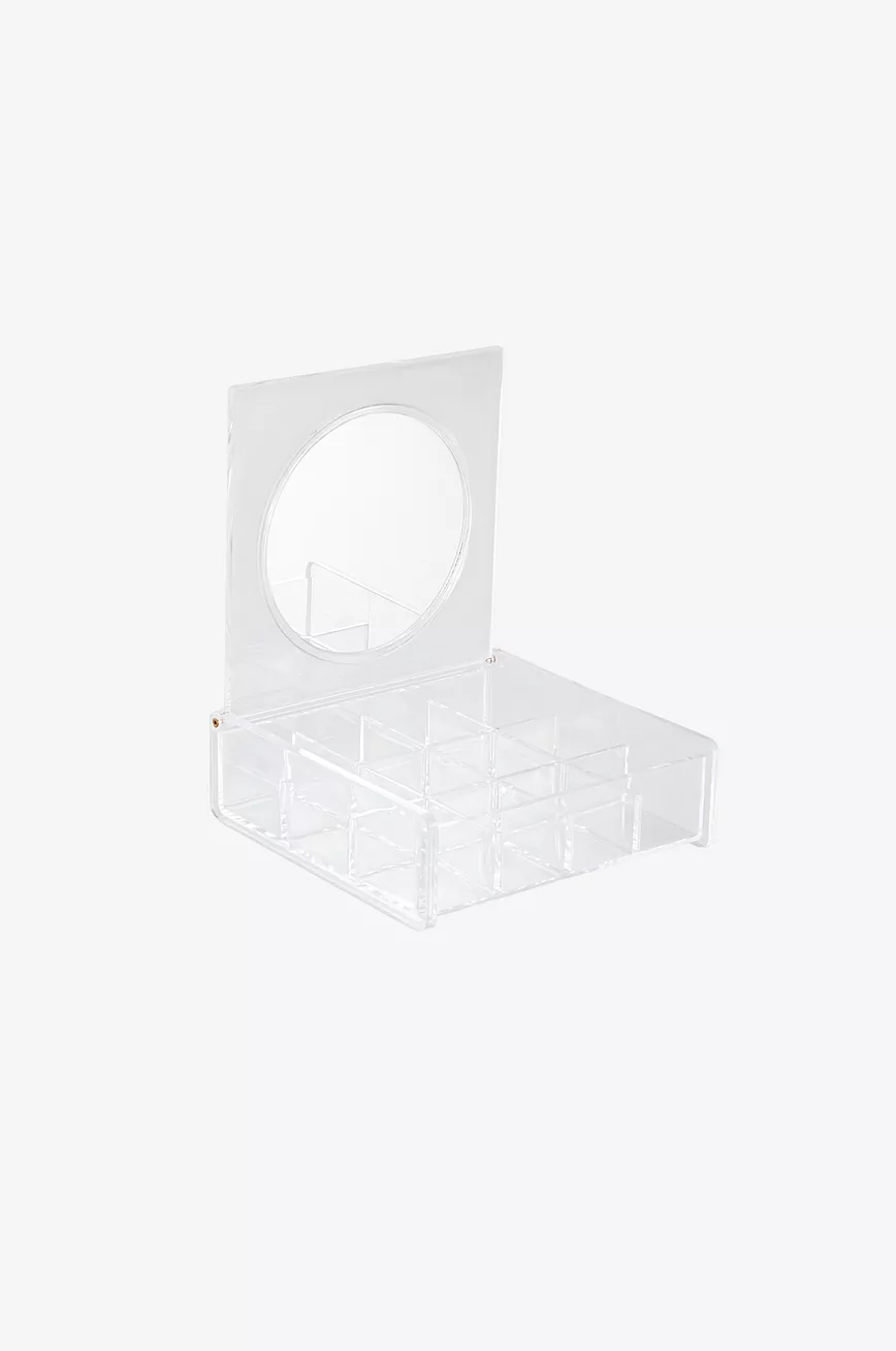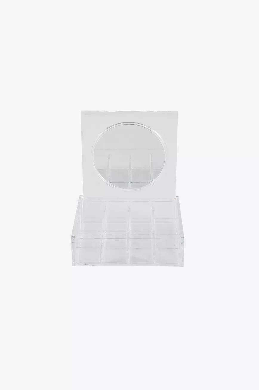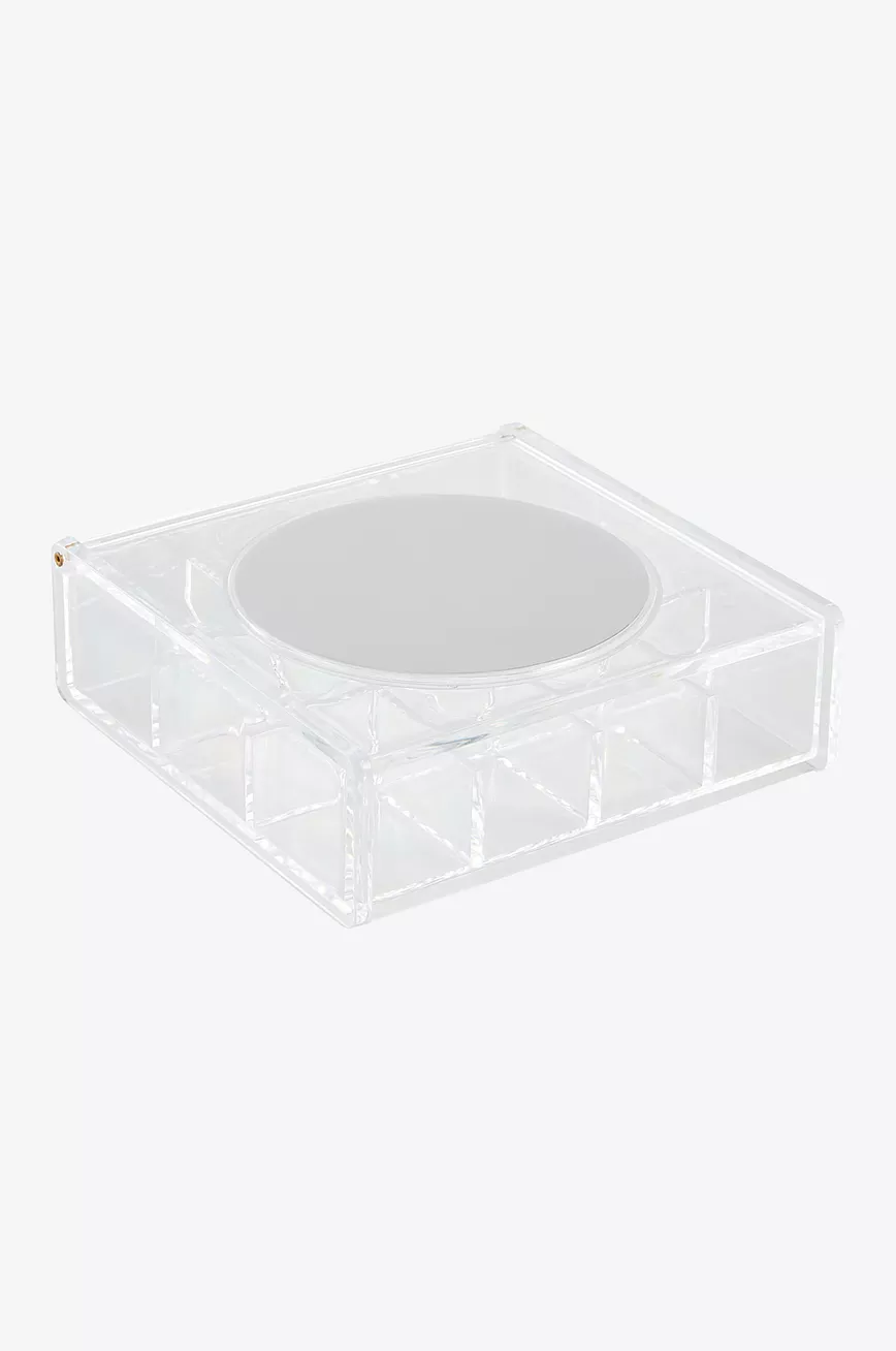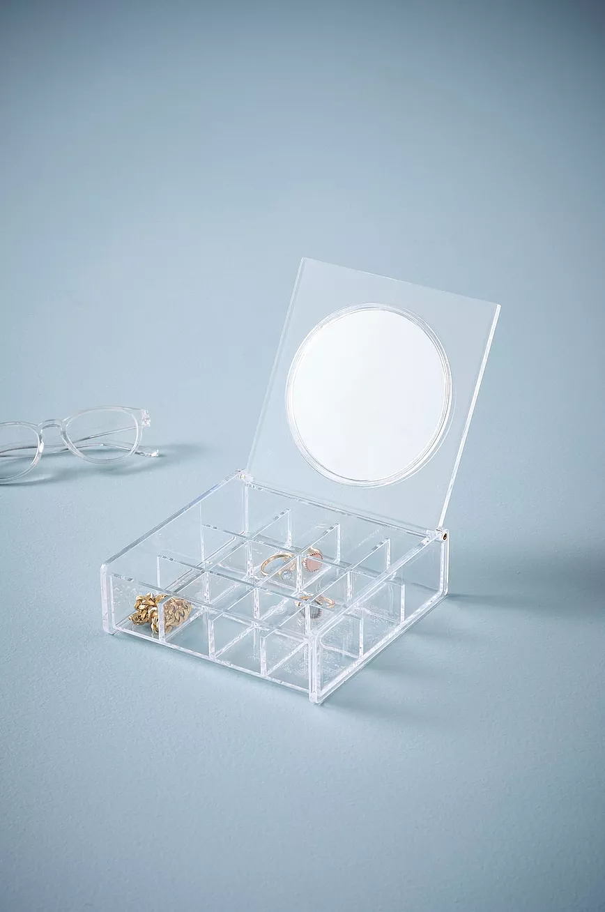 Dekorativt smykkeskrin som passer perfekt til oppbevaring av smykker eller bare ha fremme som pynt. Smykkeskrinet er av akrylglass og har et rundt speil inni.