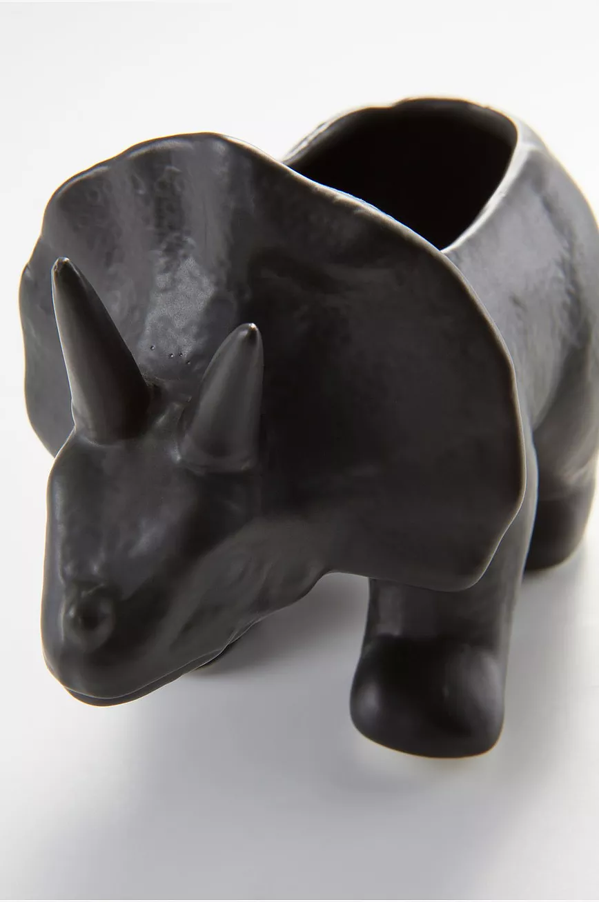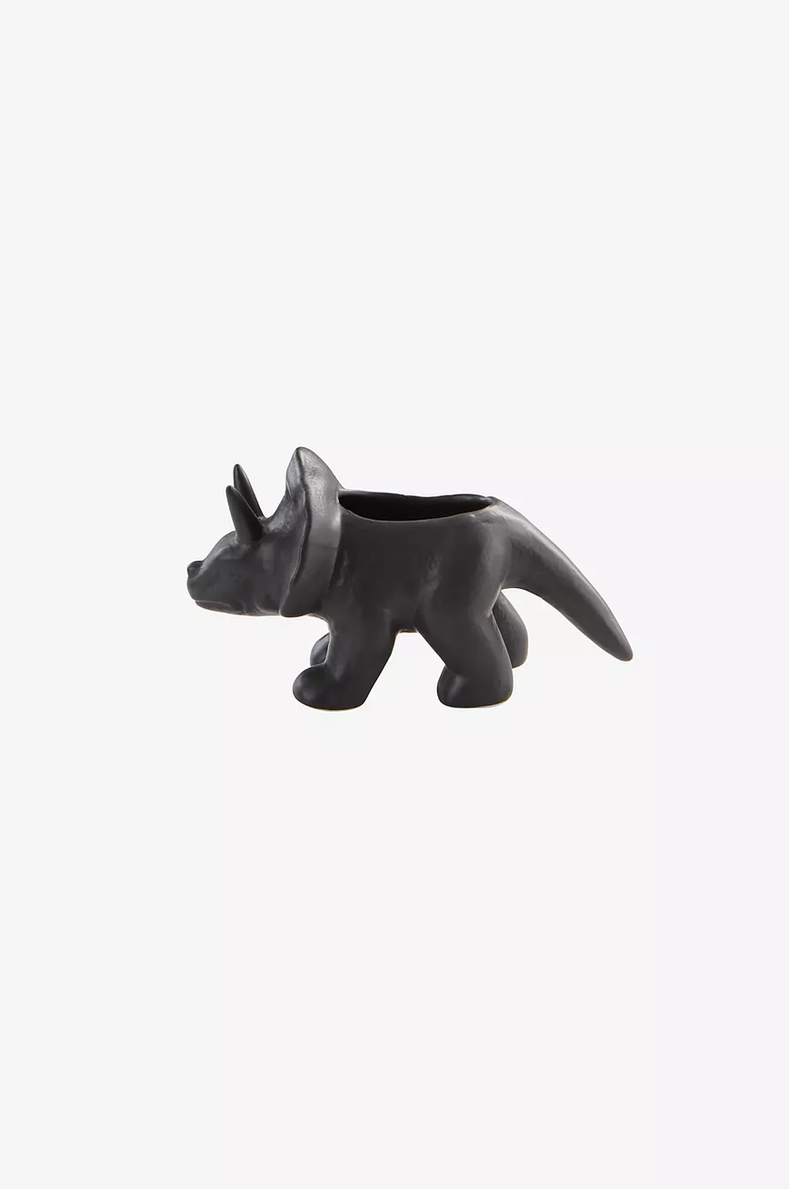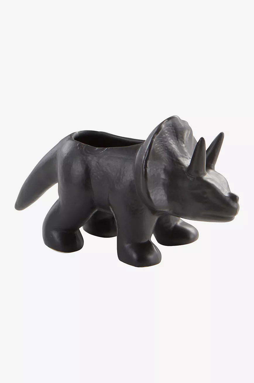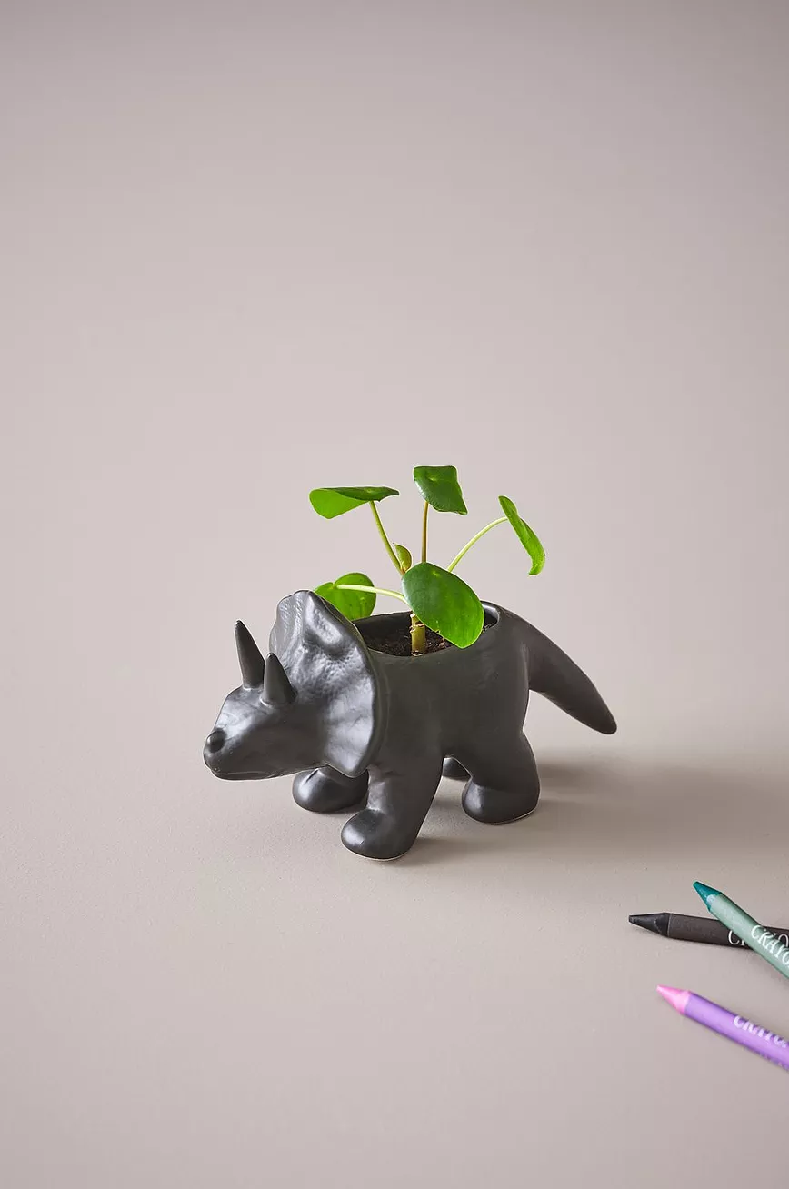 Krukke av keramikk. Krukken har form som en dinosaurus, søt og liten, passer perfekt i barnerommet. Ut- og innsiden er glasert i samme farge. Husk at keramikk kan slippe gjennom fukt.