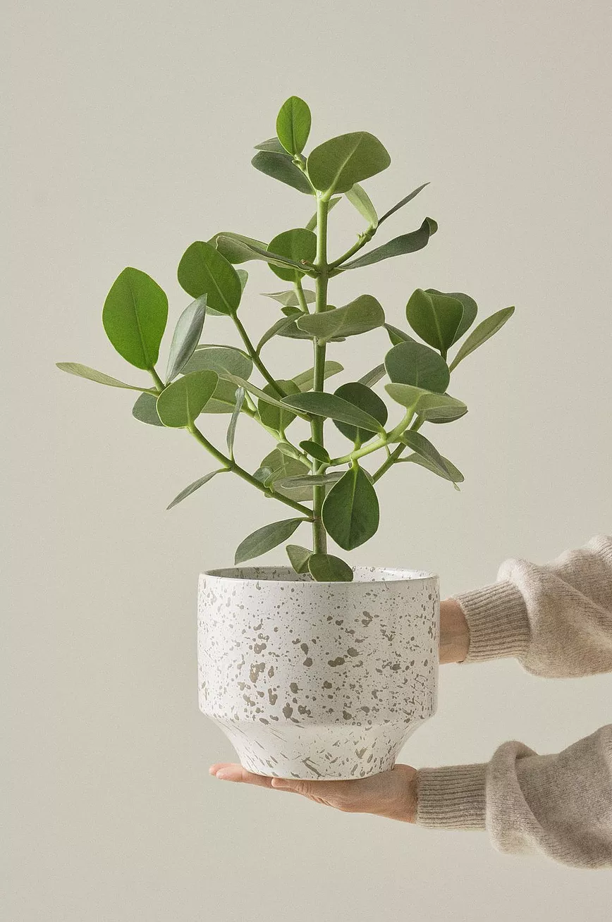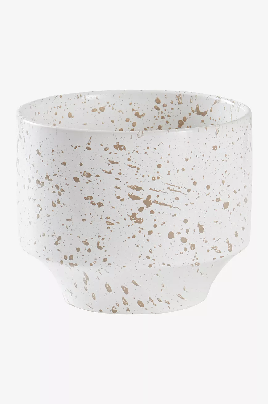 Håndlaget potte av keramikk med lekkert flekkmønster som har herlig retrofølelse. Potten har mykt avrundet form, noe avsmalnende oppover, og glasuren har høyblank overflate. Innsiden er også glasert. Det fine håndverket gjør hver potte unik. Husk at keramikk kan slippe gjennom fukt.