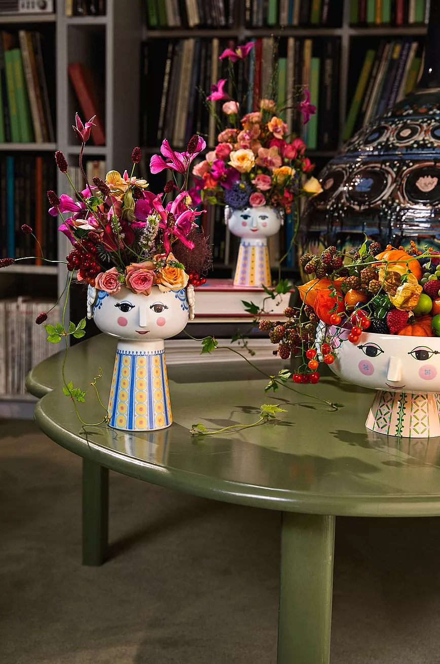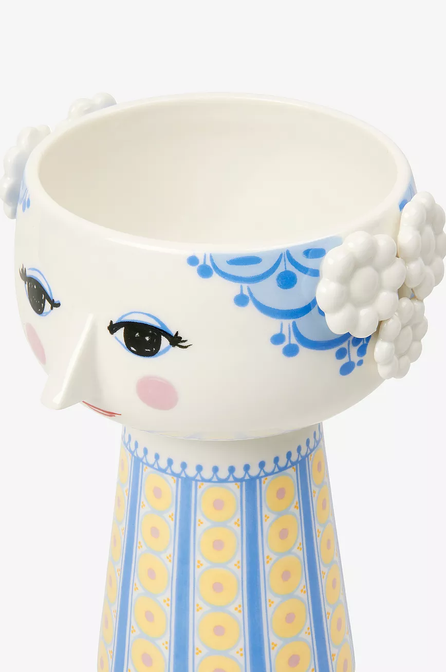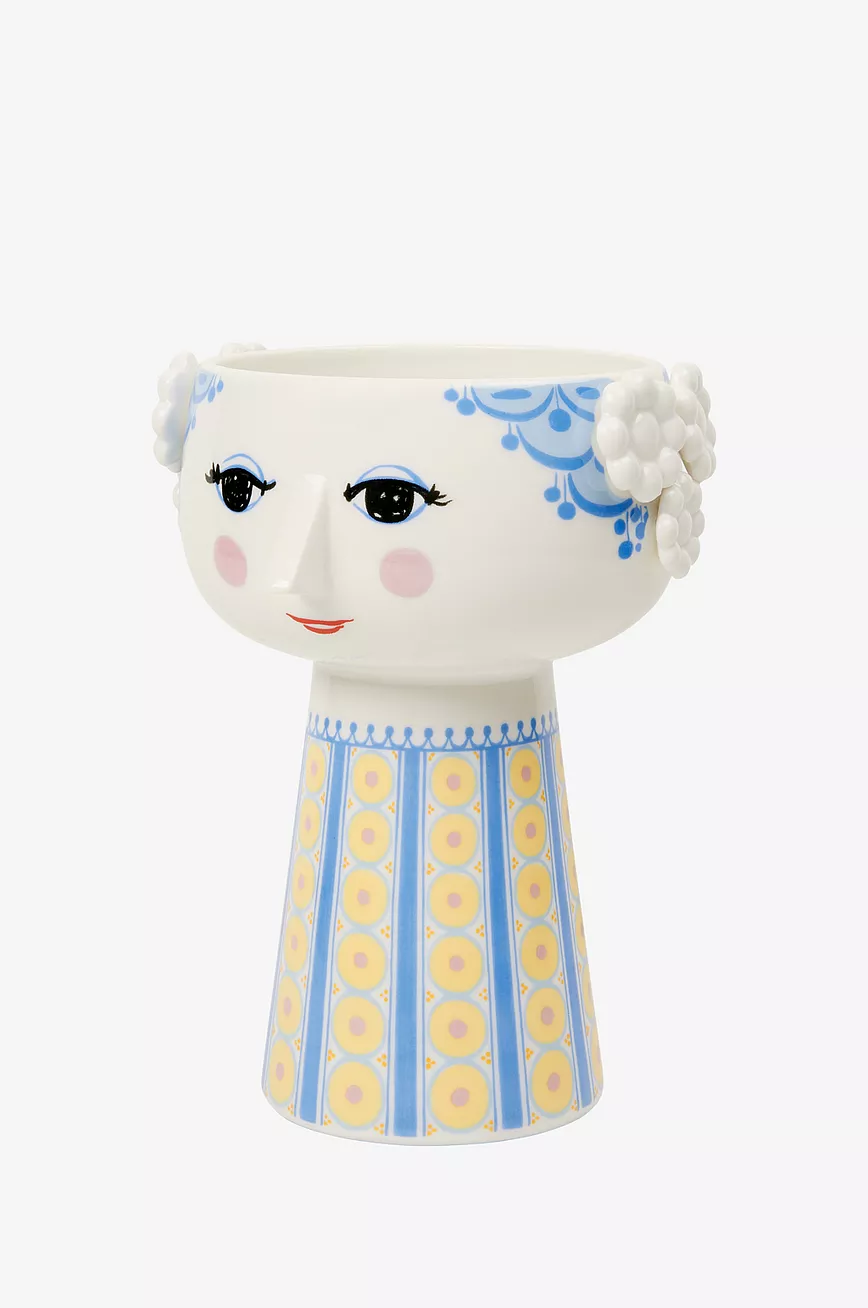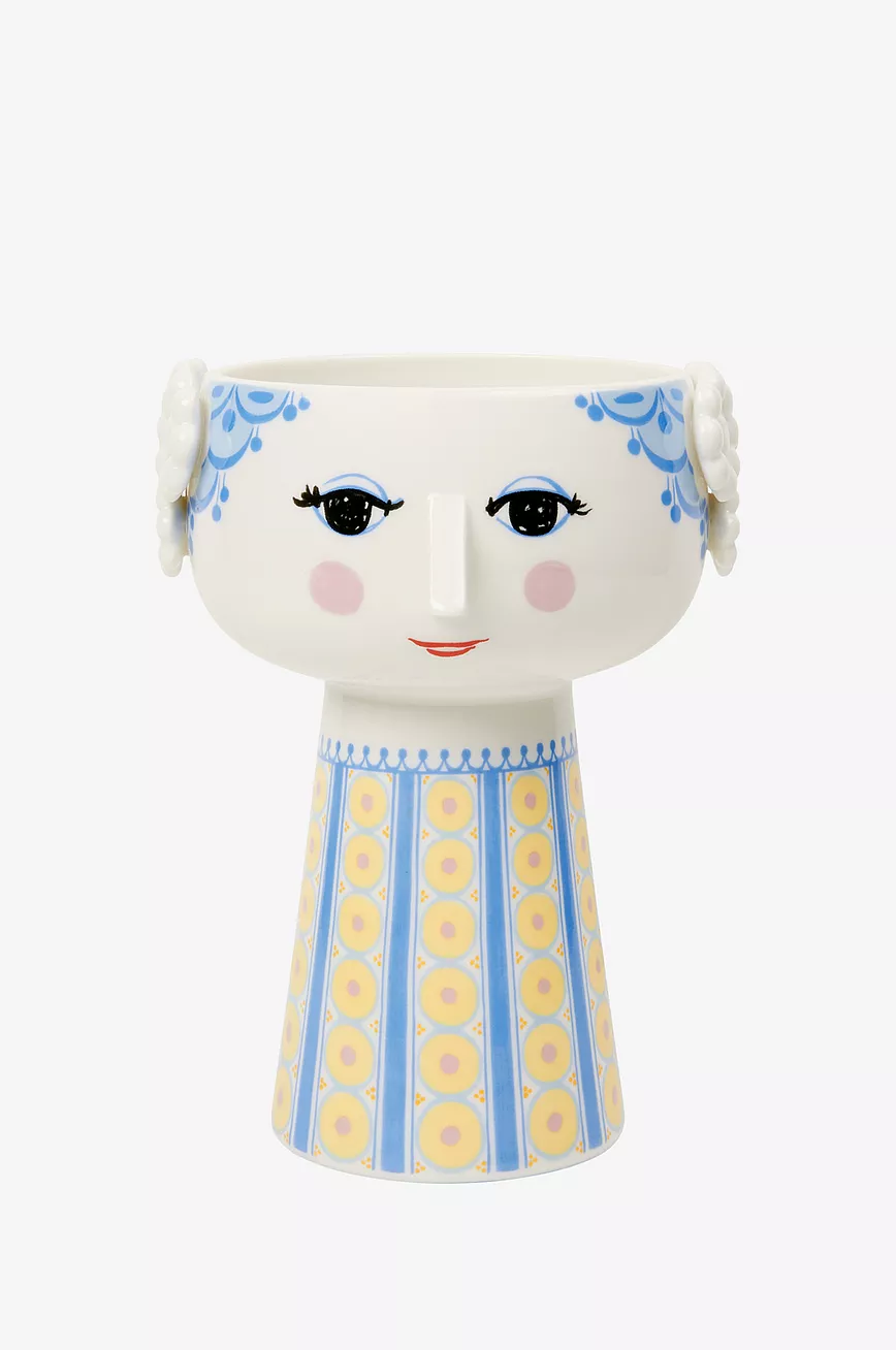 Bjørn Wiinblad representerer alt som er sprøtt, originalt, kreativt og fantastisk. Med den vakre og smilende eva-blomsterpotten fra bjørn wiinblad kan du skape en original og fargerik stemning i hele hjemmet. Vasen er 18,5 cm høy, har en diameter på 12,5 cm og er produsert av blankt glasert porselen. De mandelformede øynene og spisse nesen er wiinblads originallinjer, mens det fargeglade kjolemønsteret er en nytolkning av bjørn wiinblads illustrasjoner fra arkivet. Formen er inspirert av bjørn wiinblads opprinnelige og ikoniske eva-vaser med bredt hode og kjegleformet kropp. Bjørn Wiinblad var en glad kunstner med stor og fargerik personlighet. Han gjorde ting på sin måte uten å være redd for å drømme og tenke stort. Hans ånd fremtrer i den unike eva som oppmuntrer oss til å uttrykke vår egen stil og personlighet i innredningen med fargerike blomsterbuketter, eksotiske planter, lys og kreativ dekor. En ting er sikkert: livet er aldri kjedelig når eva flytter inn.