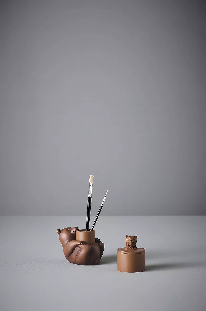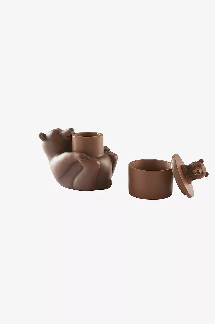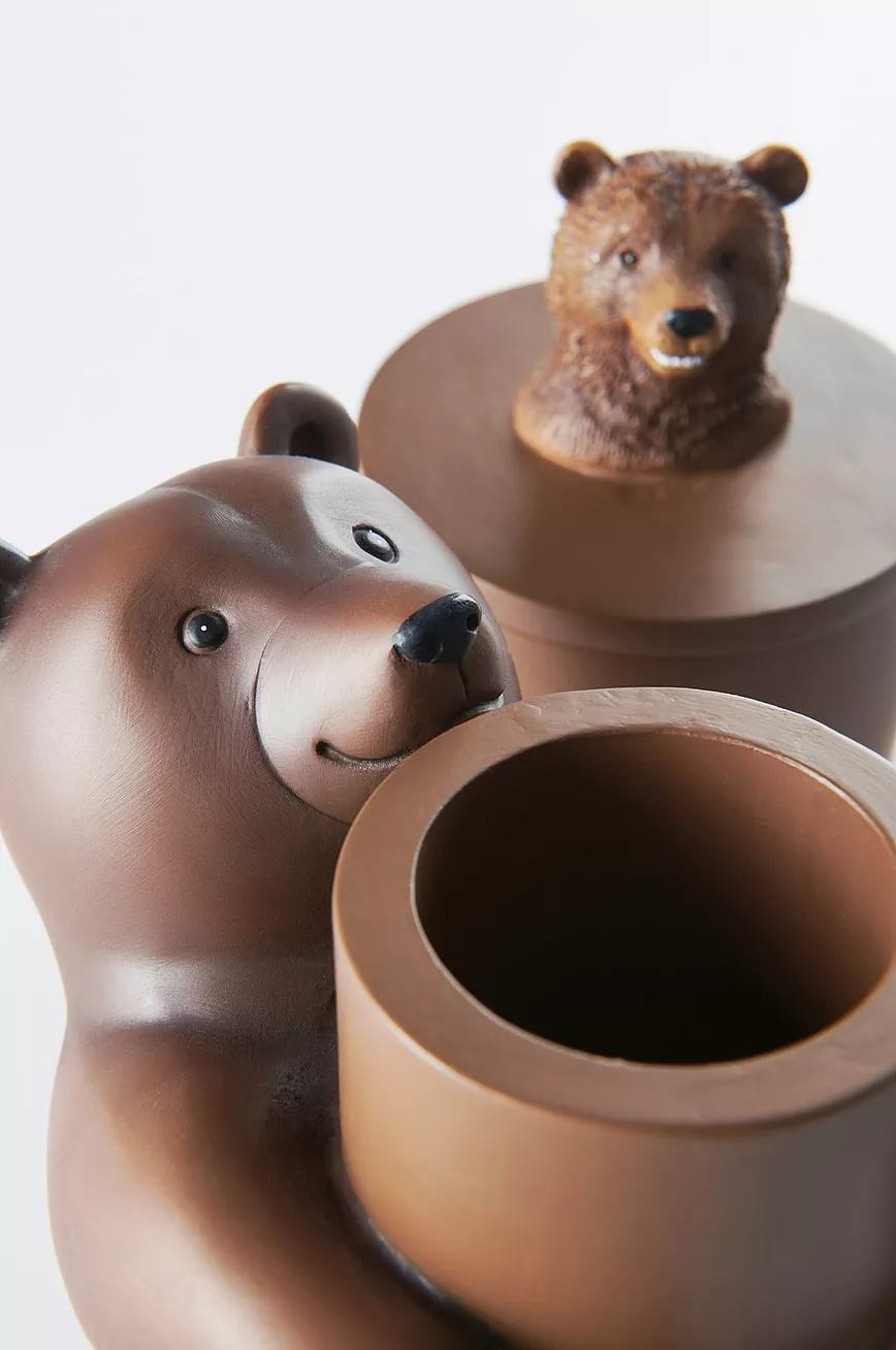 2-pk krukker i polyresin. Den ene lille krukken har lokk med et lite bjørnehode som knott, og den andre har en liggende bjørn som holder krukken på magen. To praktiske små bokser som passer perfekt til at oppbevare penner eller smykker i.