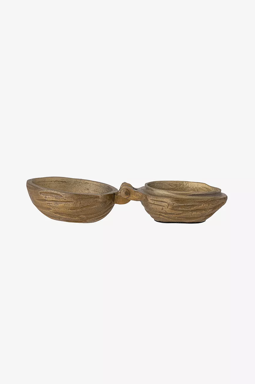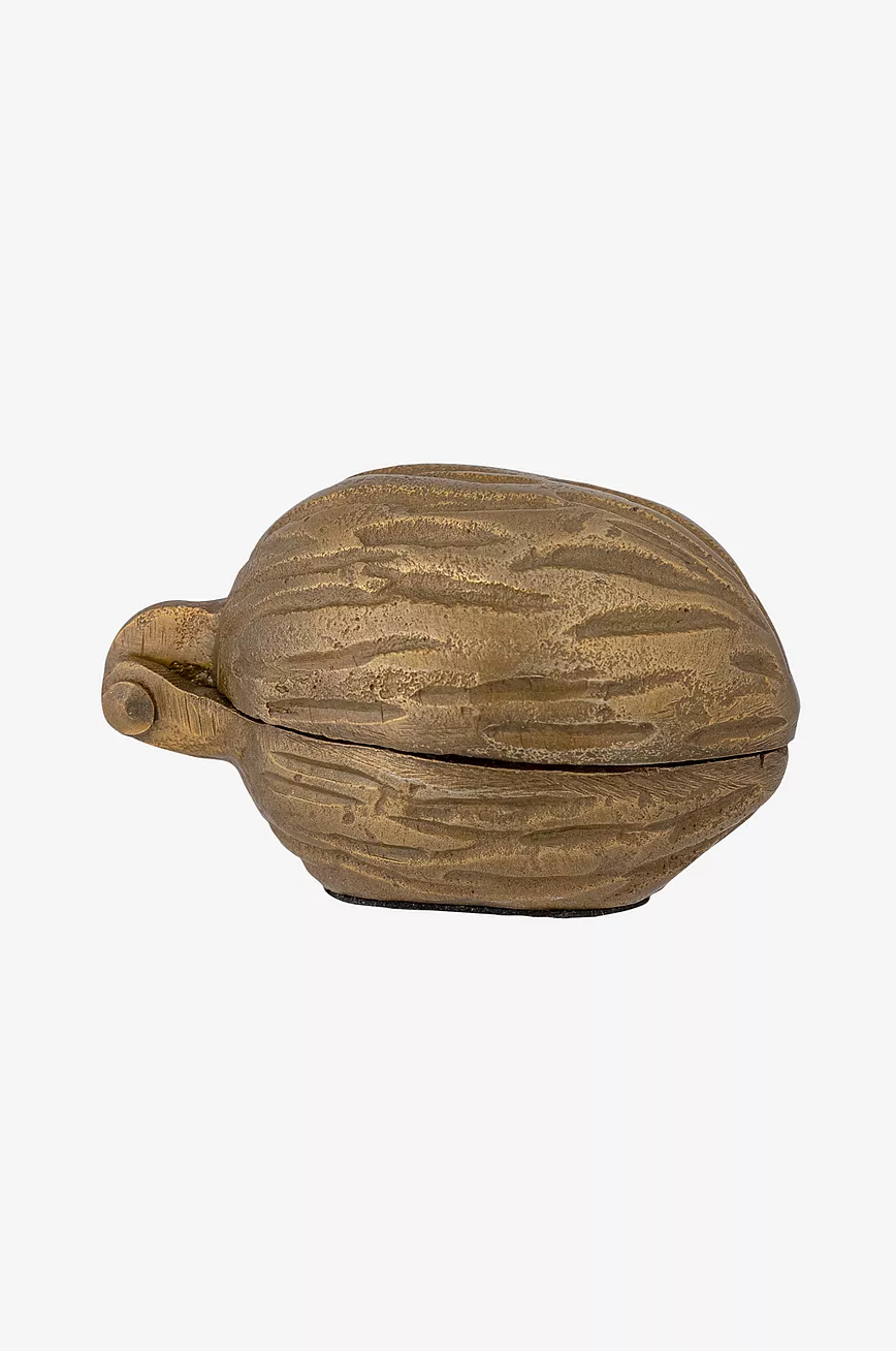 Bex pyntegjenstand fra Bloomingville er et lite skrin i aluminium formet som en nøtt med lokk. Dn har et antikt utseende i vakker messing, og er perfekt som dekor eller kanskje for å oppbevare favorittsmykkene.