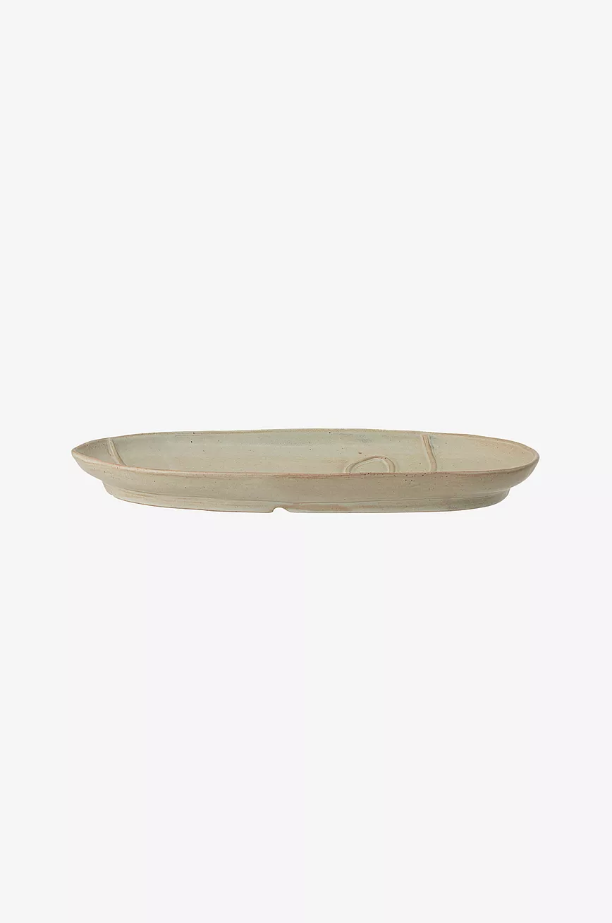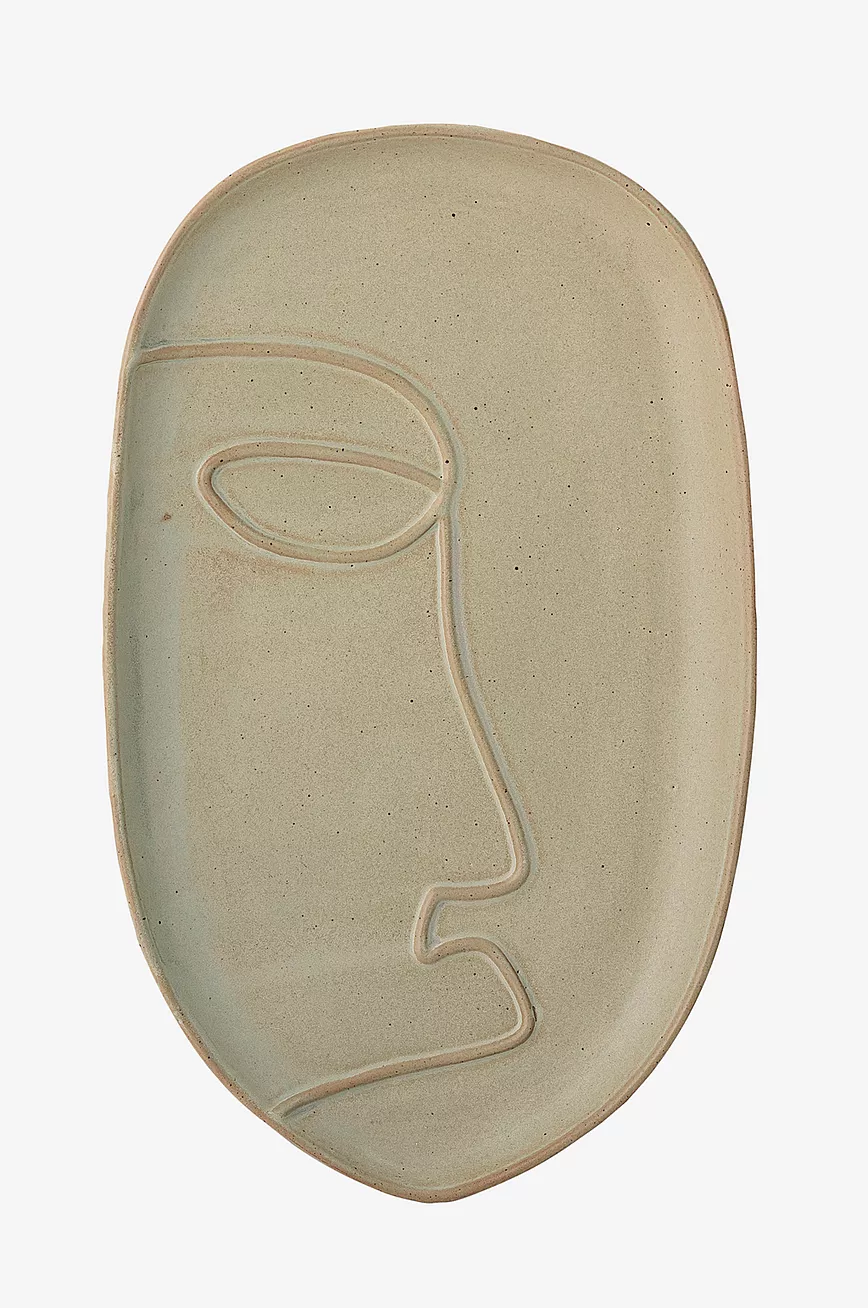 Et brett som først ser svært enkelt ut, med runde kanter og lett spiss ende. Men ansiktsmotivet, som er svært populært denne sesongen, får det til å skille seg ut. Den abstrakte konturen av et ansikt smyger seg inn fra siden og bryter av brettets rene overflate. Brettet er produsert for hånd av grønt steintøy. Dette innebærer at det kan forekomme små fargevariasjoner, noe som gjør hvert brett unikt.