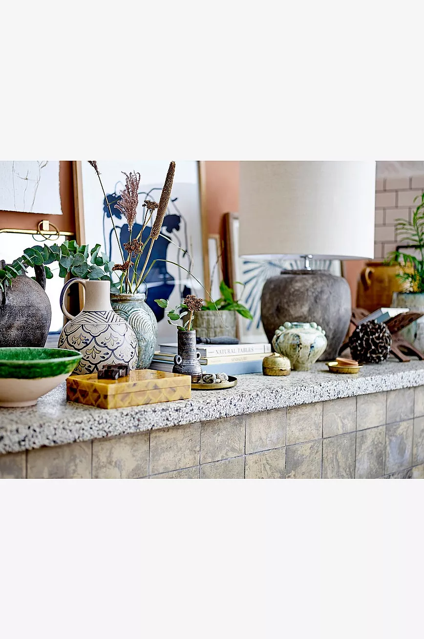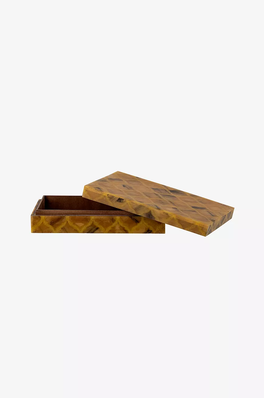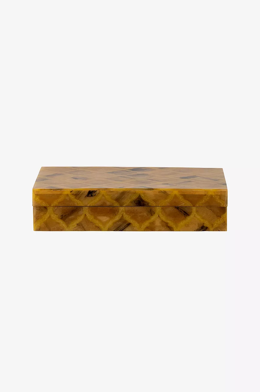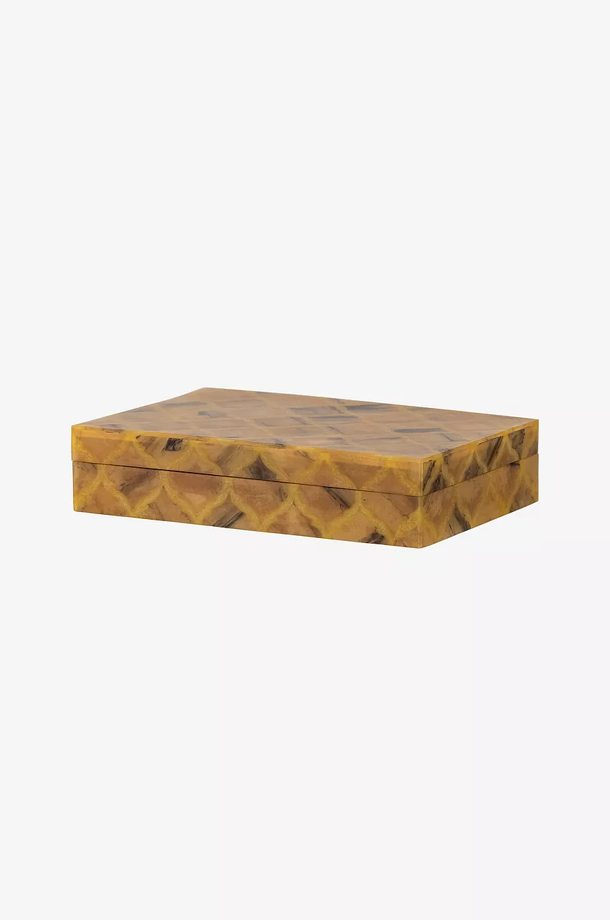 Limon eske fra Bloomingville er laget av harpiks, og er både vakker og dekorativ. Den kan brukes både til oppbevaring av småting eller rett og slett som dekor i hjemmet. Esken er dekorert med et vakkert, grafisk mønster i oransje farge. Den er laget av harpiks, noe som gir den en glatt og myk overflate.