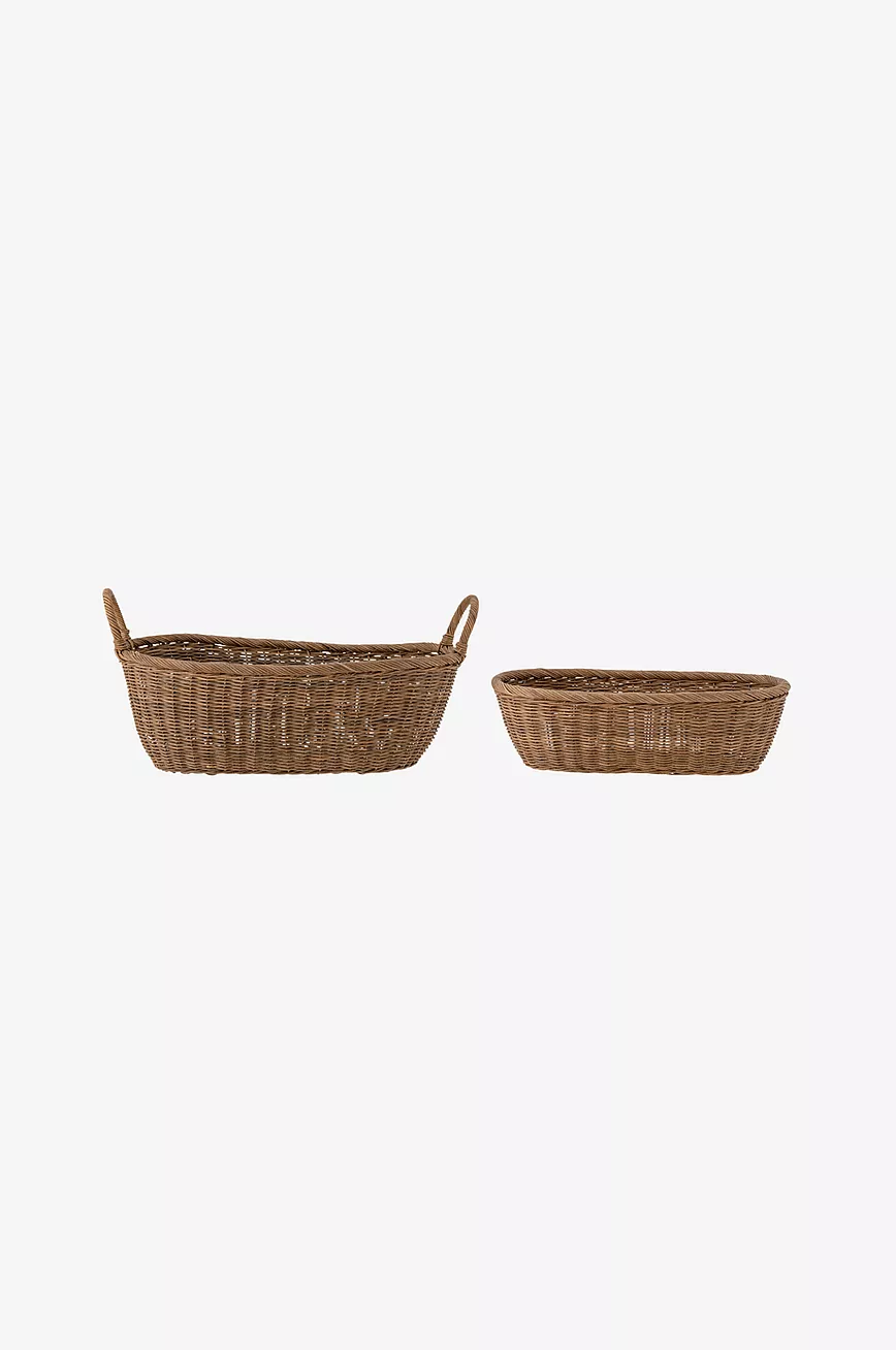 Somma kurver fra Bloomingville er et fint sett med to kurver av rotting i ulike størrelser. Den ene har håndtak og den andre ikke. De er praktiske og kan brukes både innendørs og utendørs. De er perfekte i hagen når du plukker blomster eller urter, men også for en tur i skogen for å plukke sopp eller bær. Mål: 29×52, høyde 16 cm. 34×65, høyde 21 cm.