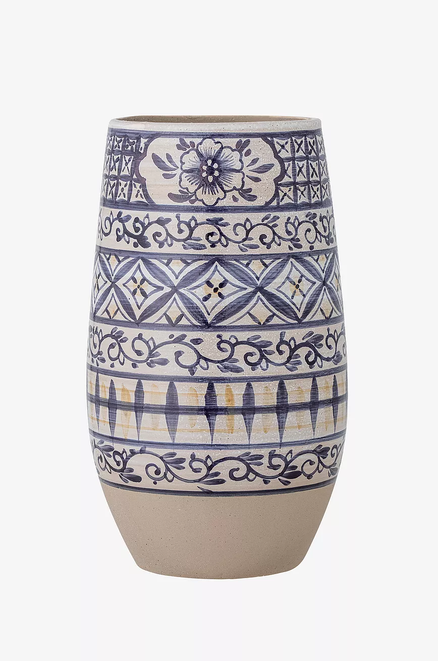 Nadya vase fra Bloomingville er laget av steintøy i blå nyanser. Vasen er malt for hånd med et grafisk mønster. Hvert produkt er unikt siden de er dekorerte for hånd.