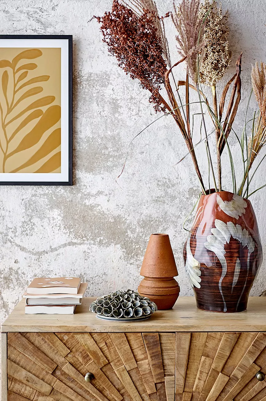 Vase i unik design som er helt håndmalt. Kombinasjonen av brune nyanser og hvite penselstrøk får den vakre vasen til å skille seg ut i rommet. Høyden på 30 cm og den brede åpningen gjør den perfekt til dine blomsterbuketter. Steintøy.
