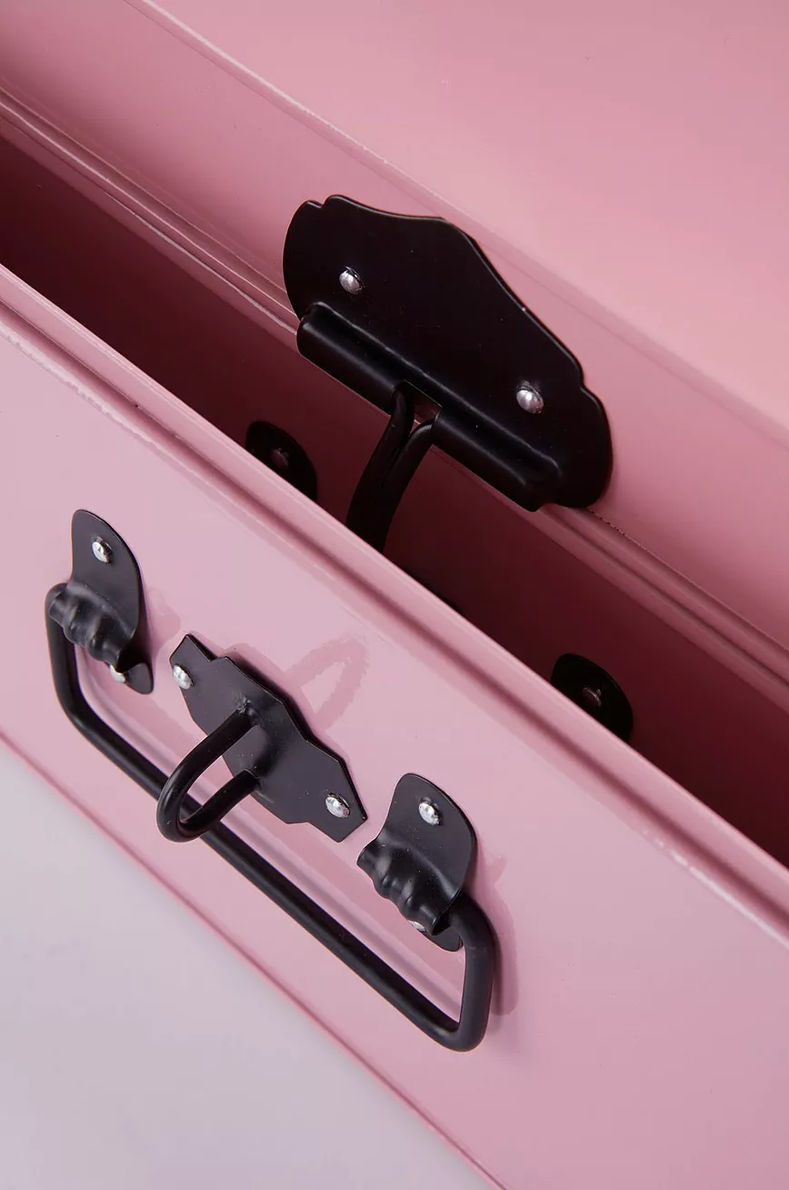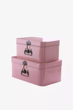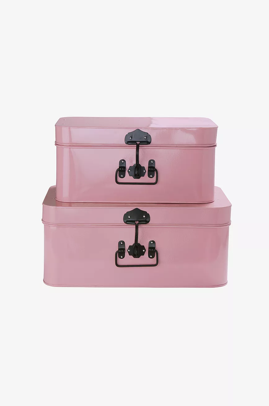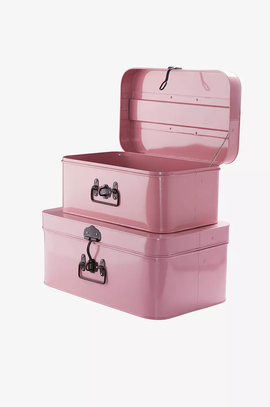 2-pk oppbevaringsbokser av pulverlakkert metall med mattsvart lås og håndtak foran. Boksene minner om en gammeldags koffert, og lokket har hengsler bak.
