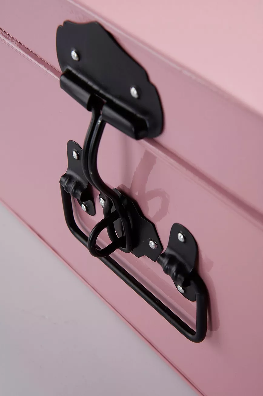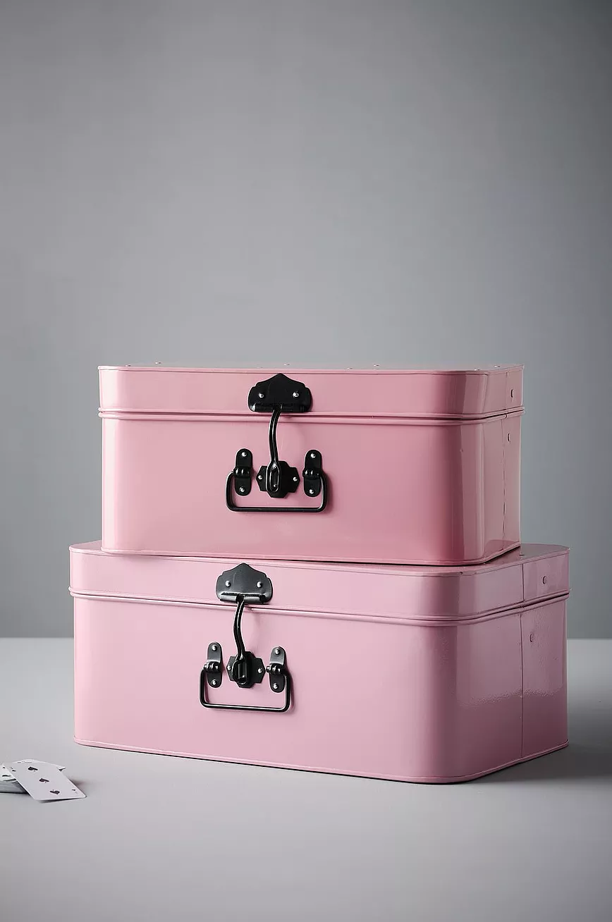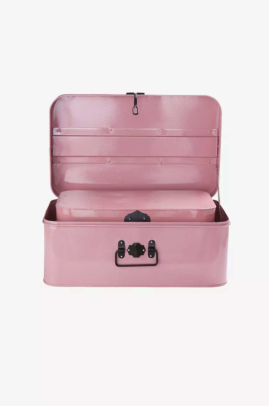 2-pk oppbevaringsbokser av pulverlakkert metall med mattsvart lås og håndtak foran. Boksene minner om en gammeldags koffert, og lokket har hengsler bak.