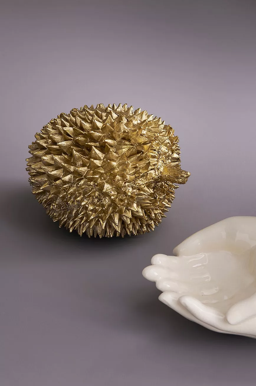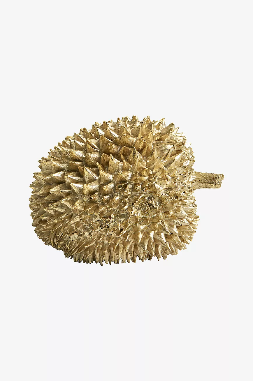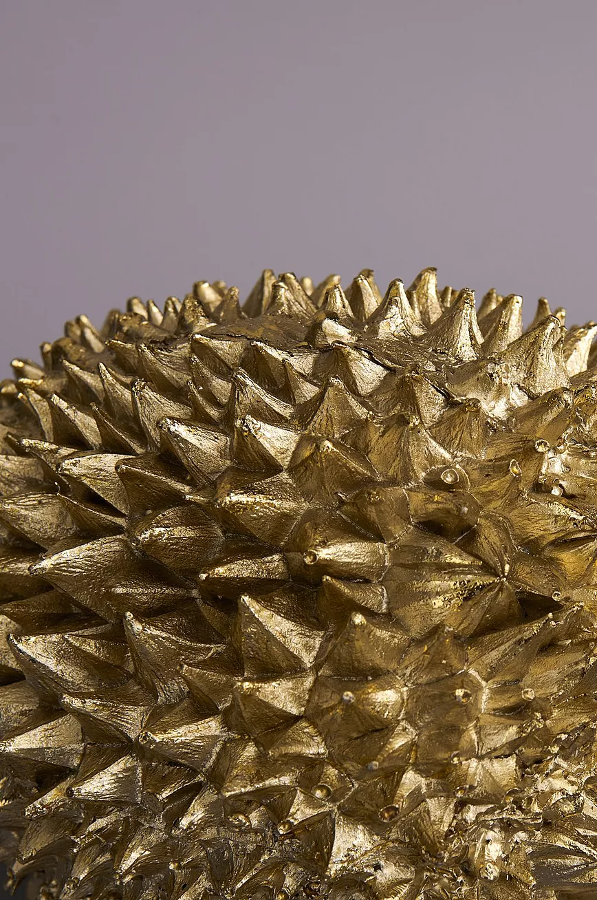 Dekor av polyresin med gullfarget finish. Høyde 15 cm, bredde 19 cm, dybde 14 cm.