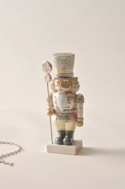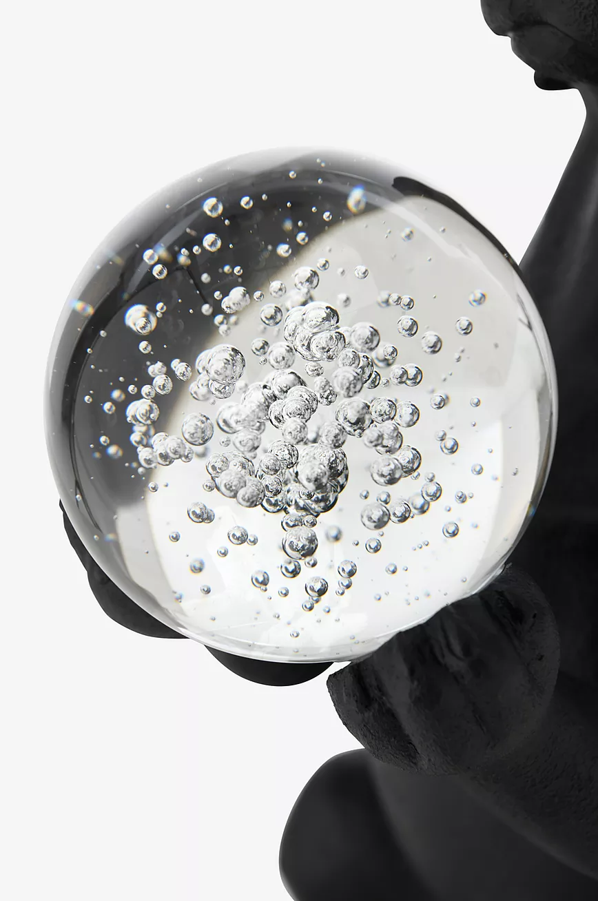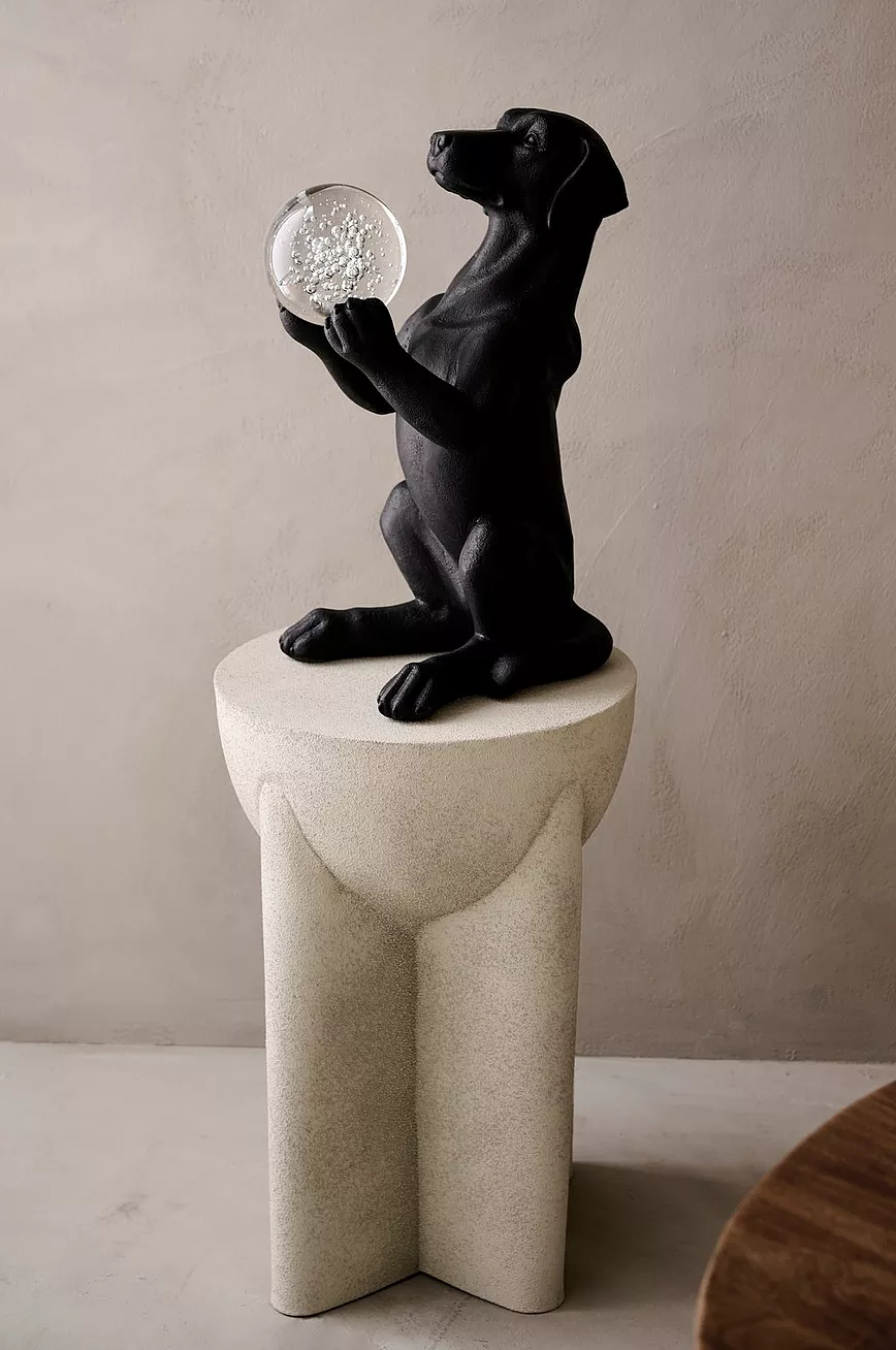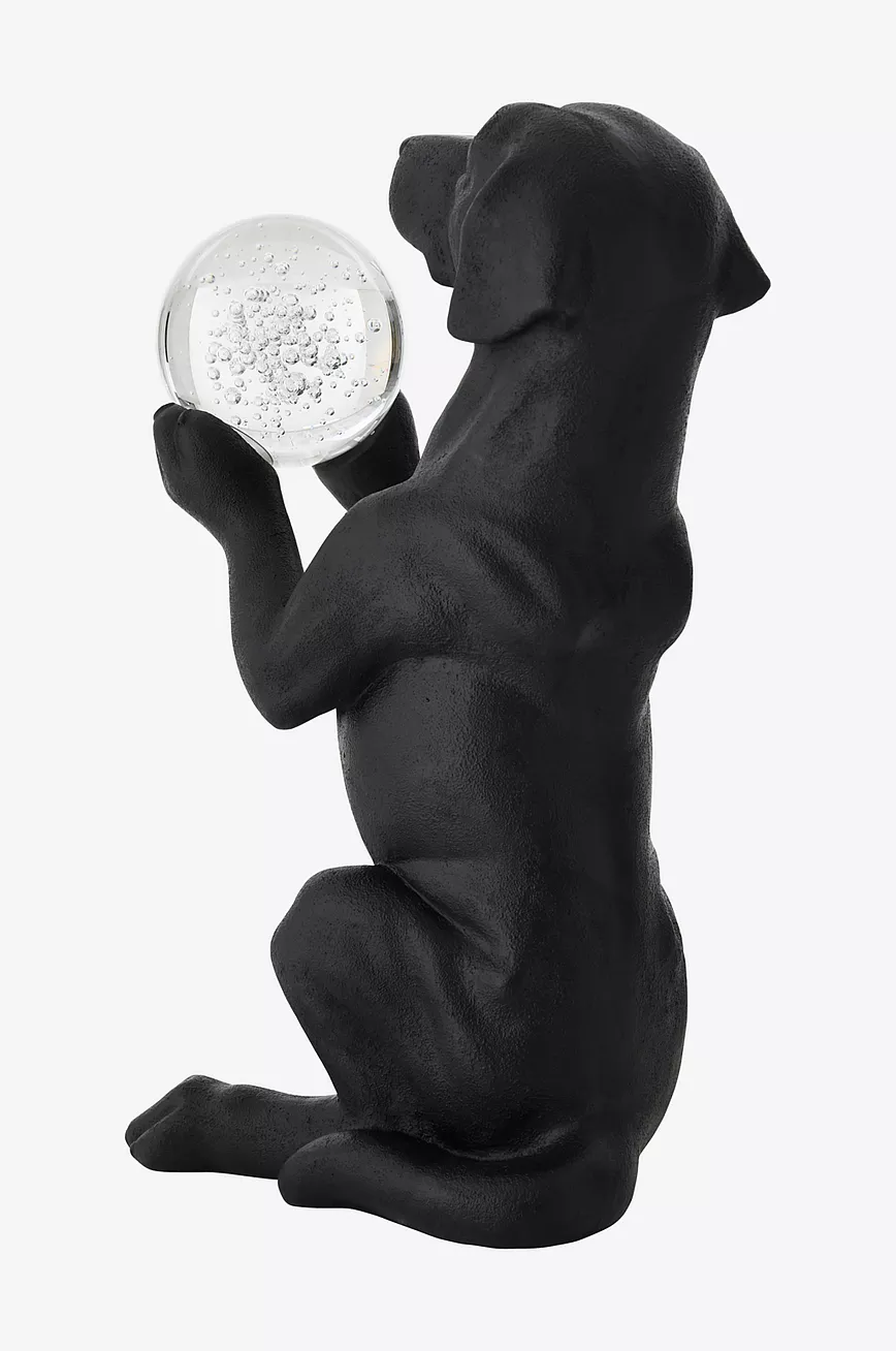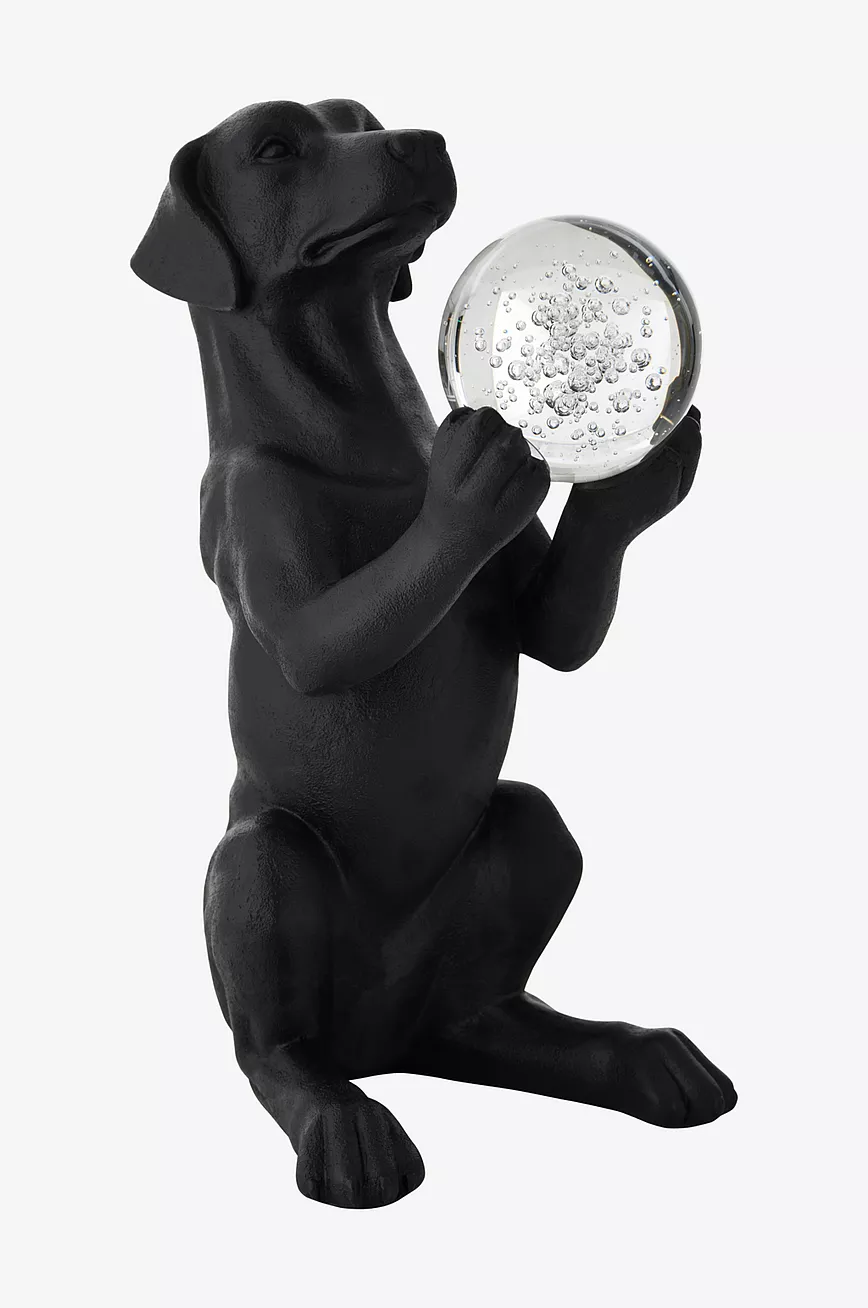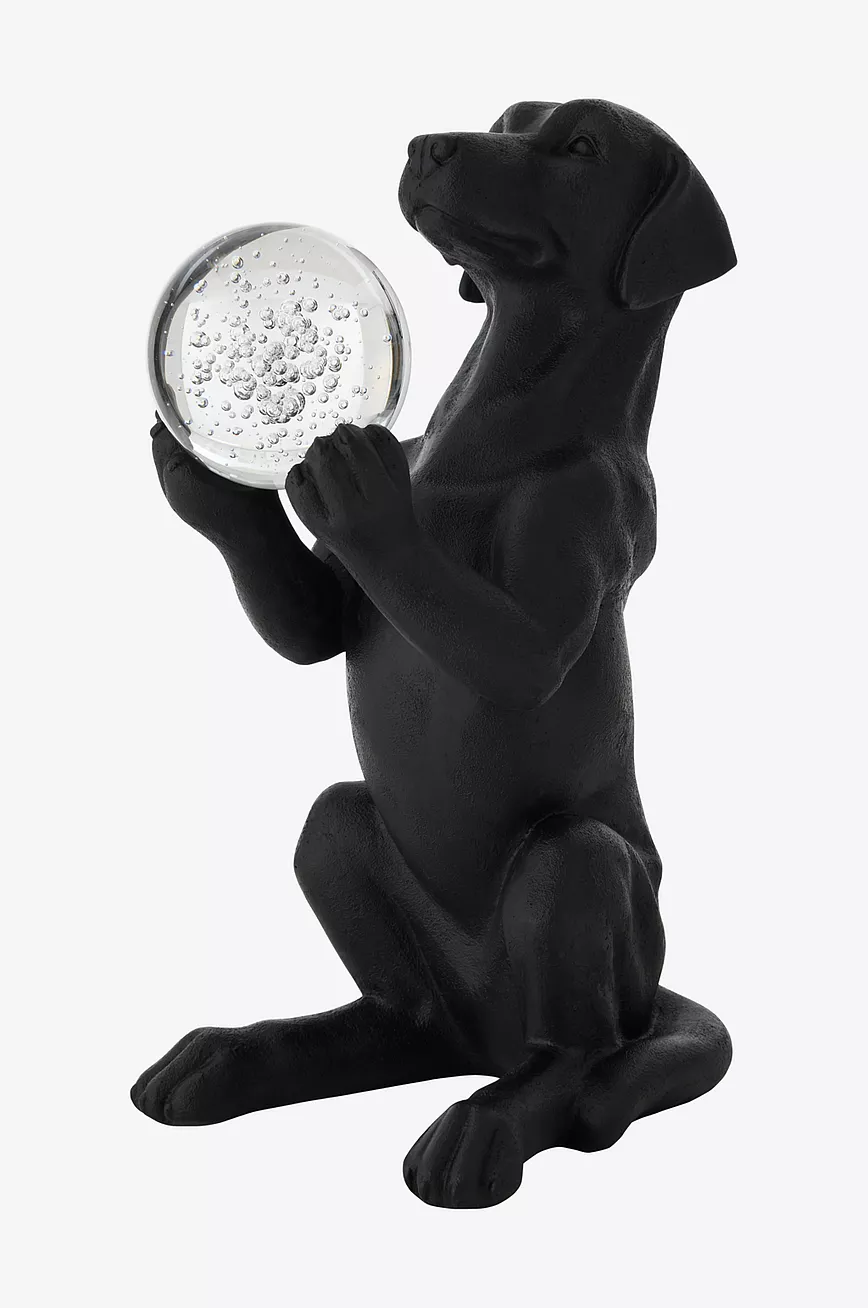 Dekor i polyresin i form av en hund som holder en glasskule.