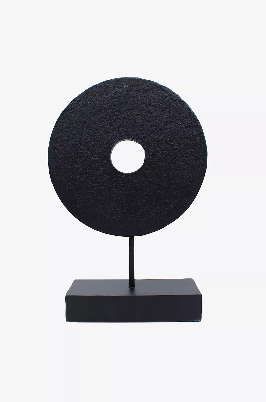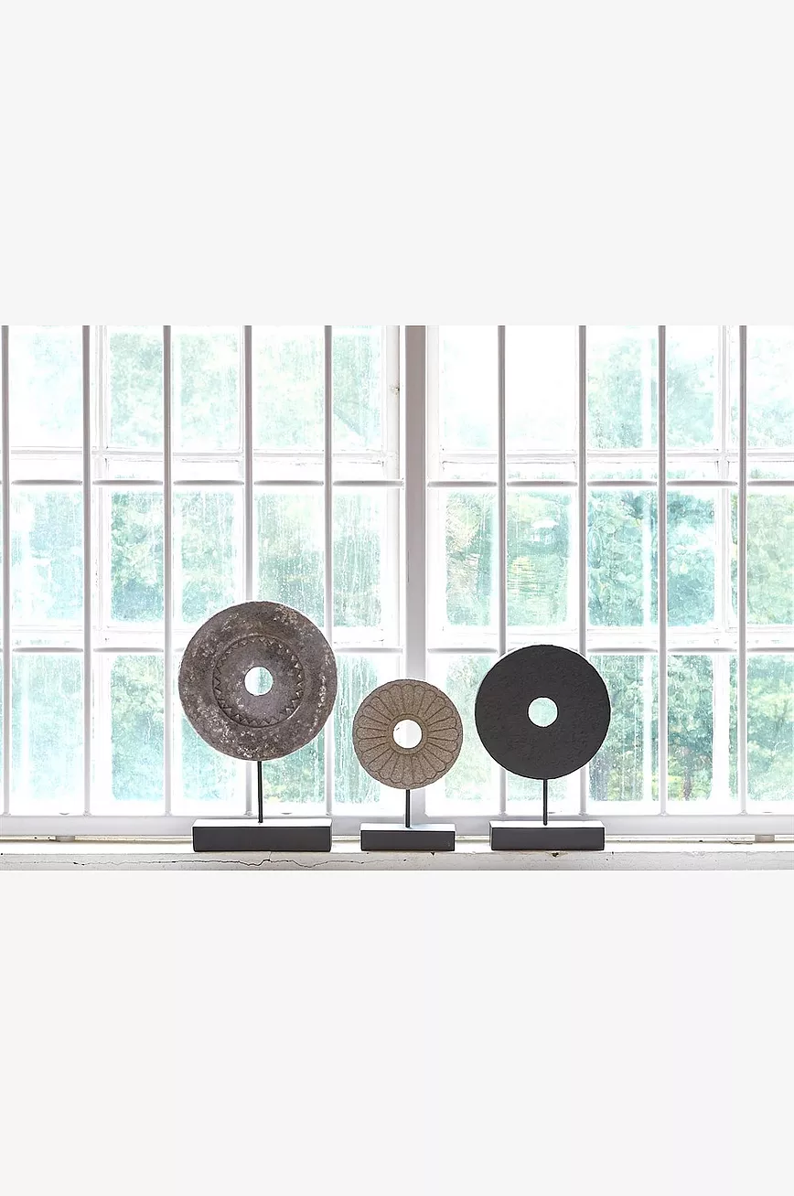 Hjulformet dekorfigur i polyresin som minner om stein.