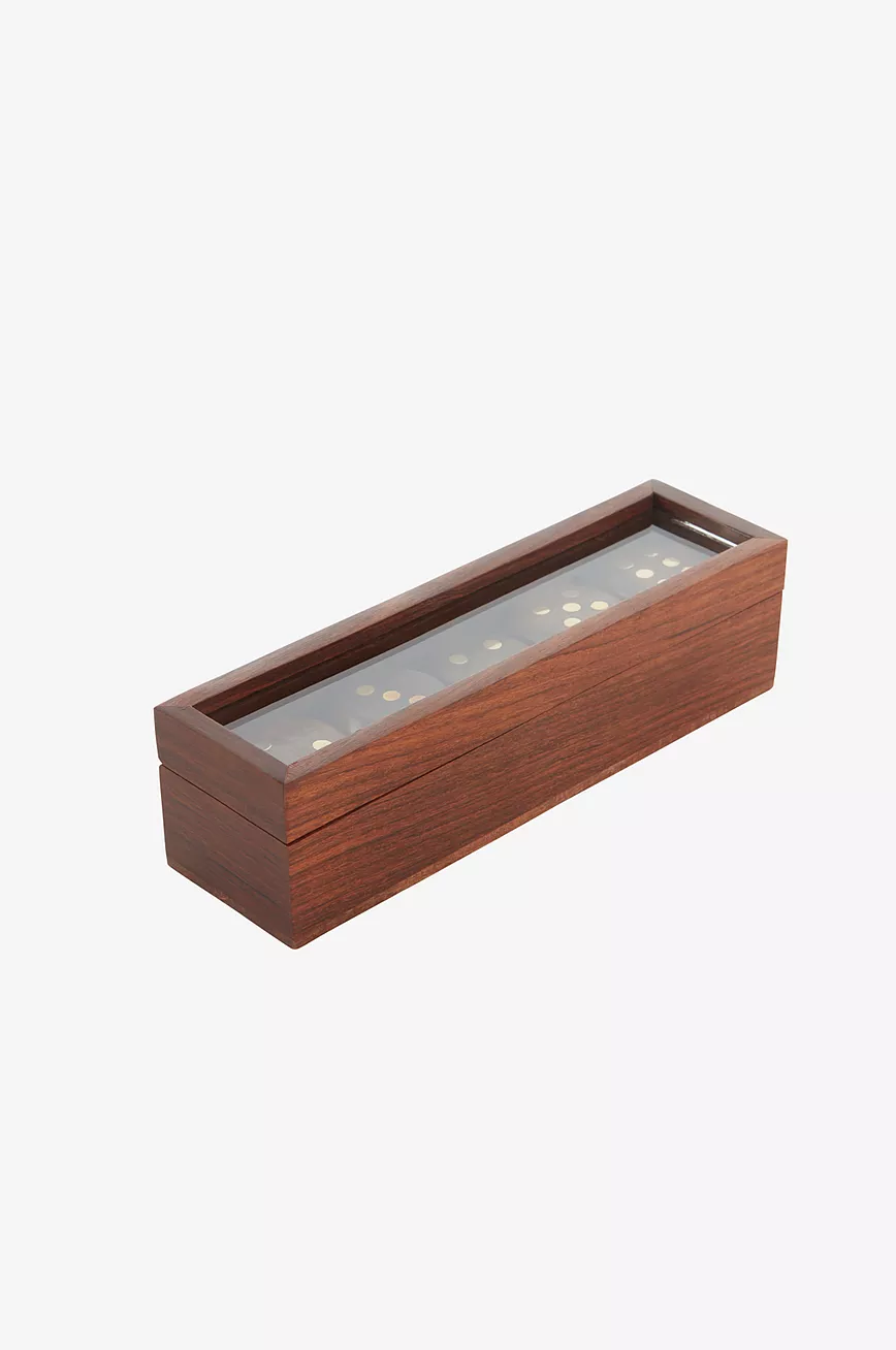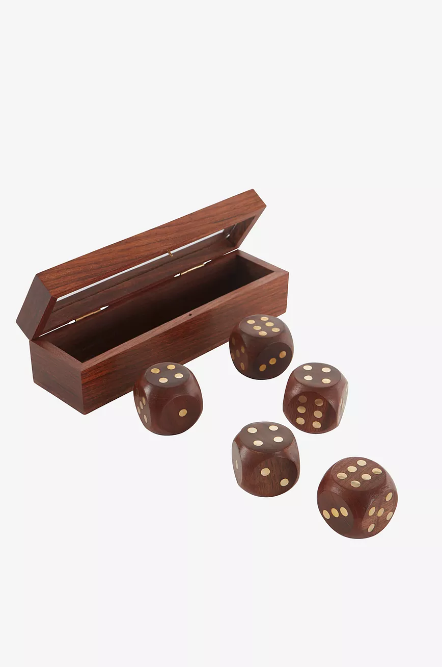 Vakker treeske i shesamtre med messingdetaljer som inneholder 5 terninger. Treesken har lokk av glass. Perfekt liten treeske til å ha framme i stua slik at man enkelt kan spille når man får lyst.