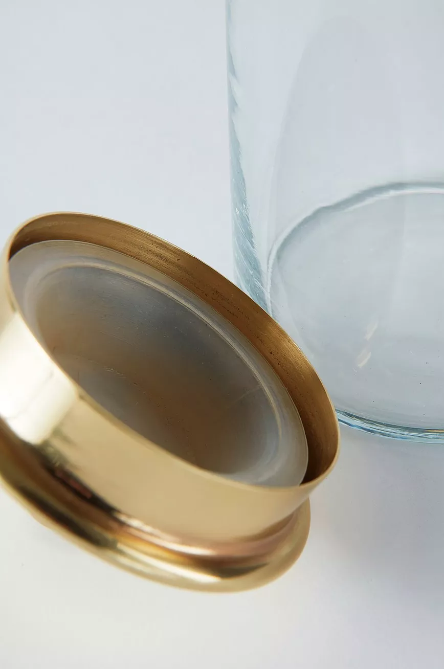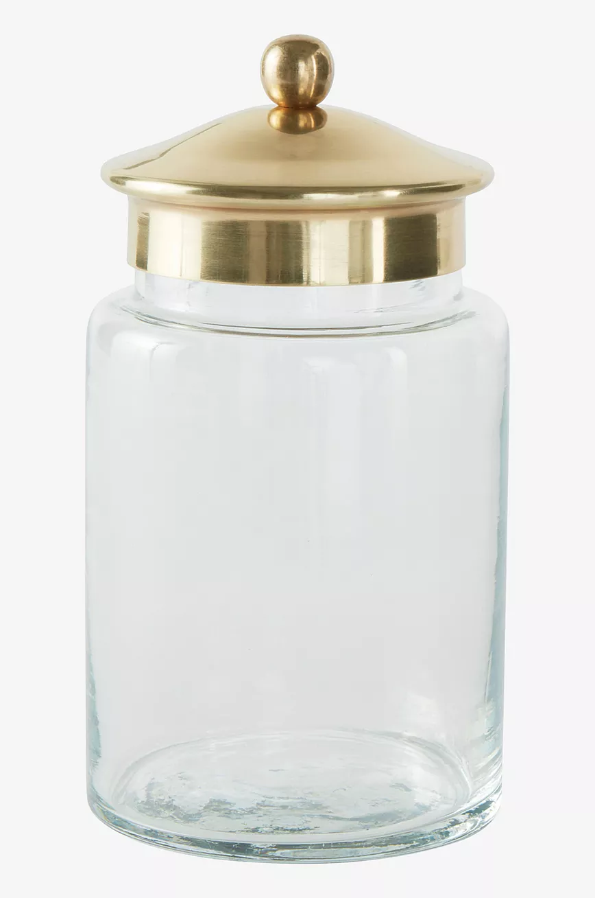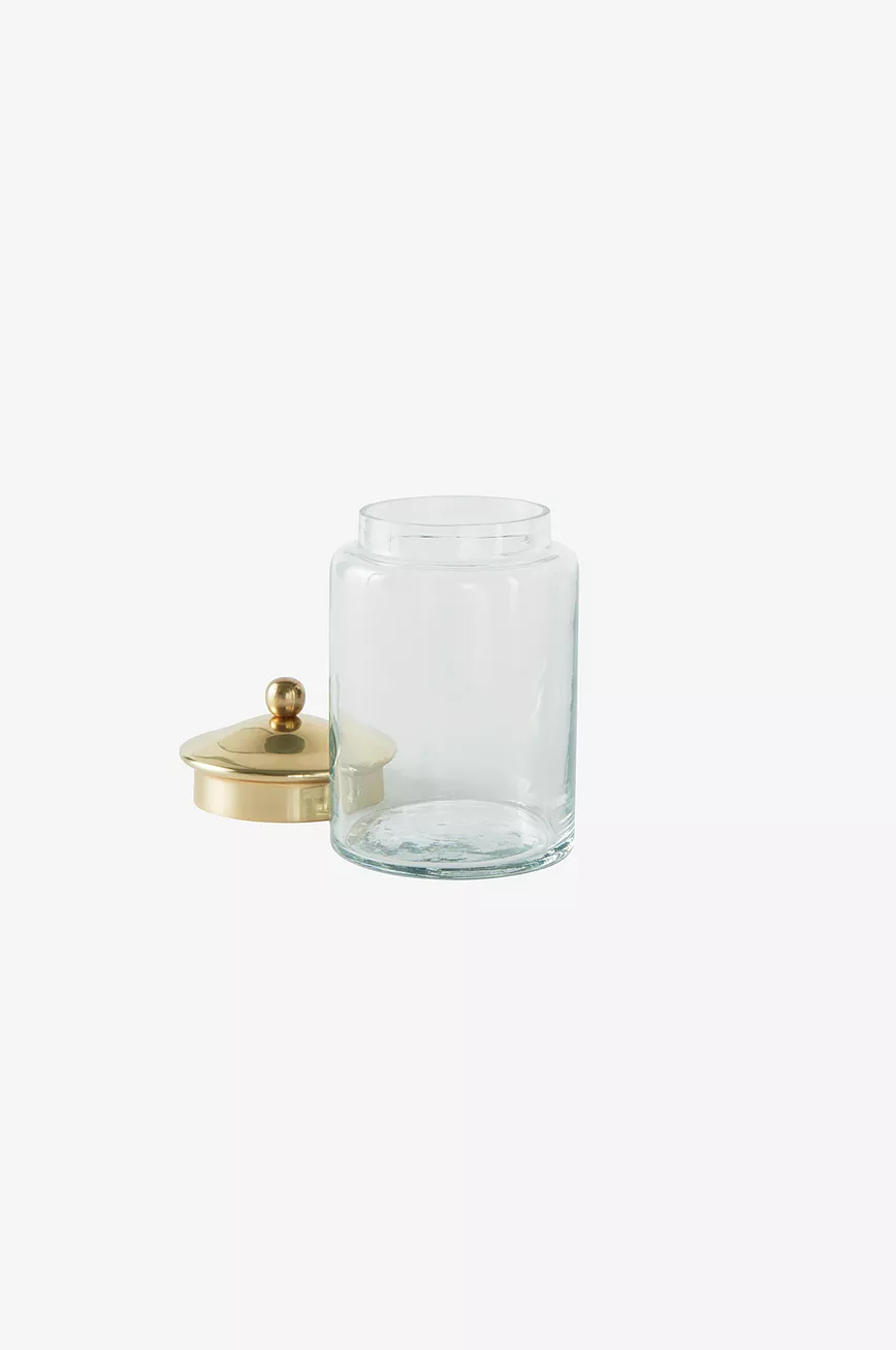 Glasskrukke med lokk av metall. Det lille metallokket har en fin antikkgullfarget finish.