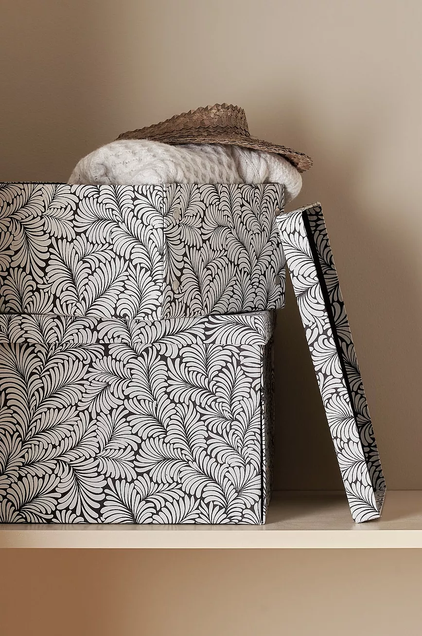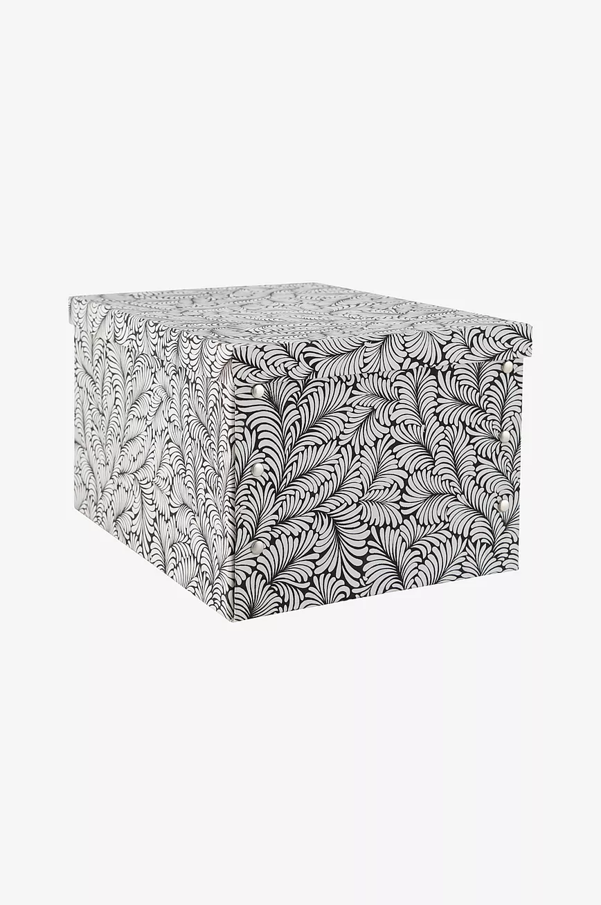 Oppbevaringseske med lokk. Produsert av gjenvunnet og håndlaget papir/kartong. Esken knappes sammen med trykknapper.
