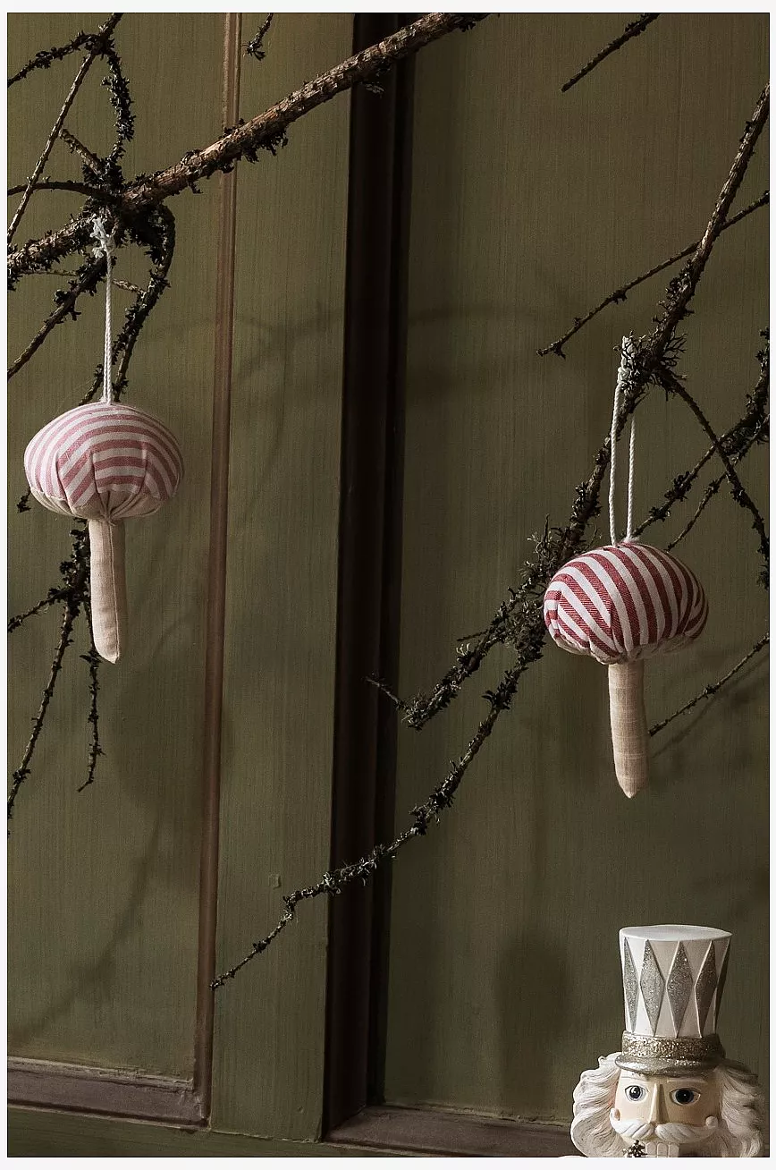 5-pk håndlagde sopper av polyester med polyesterfyll. De fem mykstoppede små soppene har polkagrisstriper i fem ulike farger sammen med hvite striper. Alle har en liten snor slik at du kan henge de opp i juletreet eller pynte noe annet. Håndverket gjør alle unike.