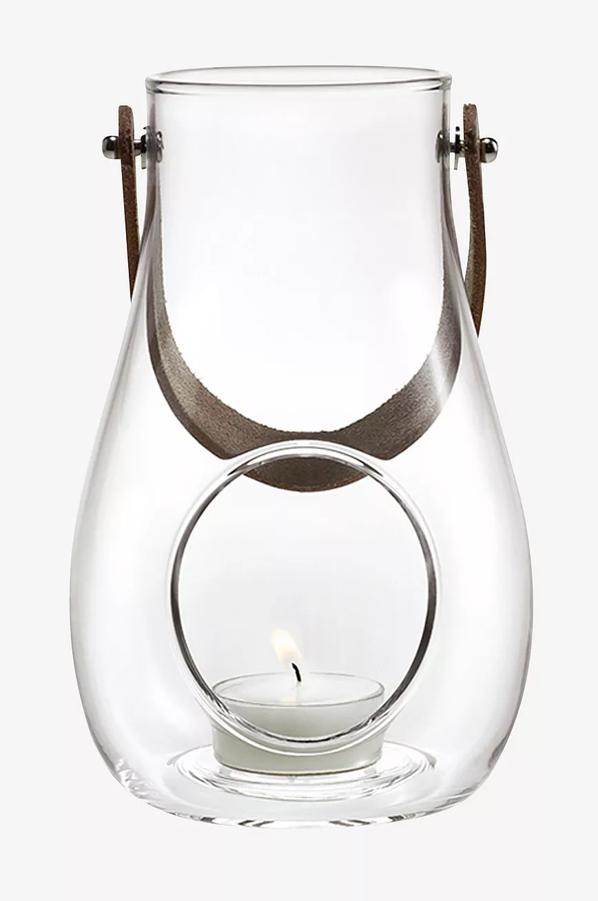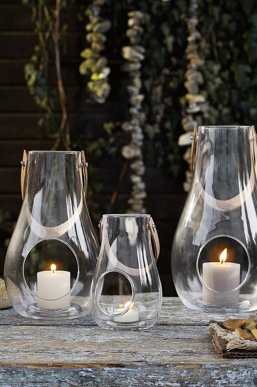 Bruk lykten fra Design with Light på bordet året rundt. Til sommerkvelder på terrassen og som dekorasjon på bord, i trappen eller vinduet. Designer Maria Berntsen har skapt den mobile lyskilden i glass og skinn, som sprer lys og hygge i skandinavisk stil. Denne lille lykten er 16 cm høy, men den fås også i en mellomstørrelse på 24,8 cm, en stor på 29 cm og en gulvutgave på 45 cm. Lytene fås i både klart og frostet glass, og er vakre å kombinere. En god gaveide – ikke minst til deg selv.