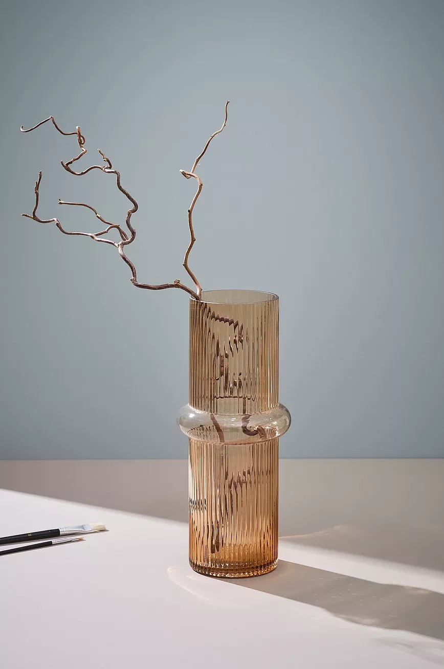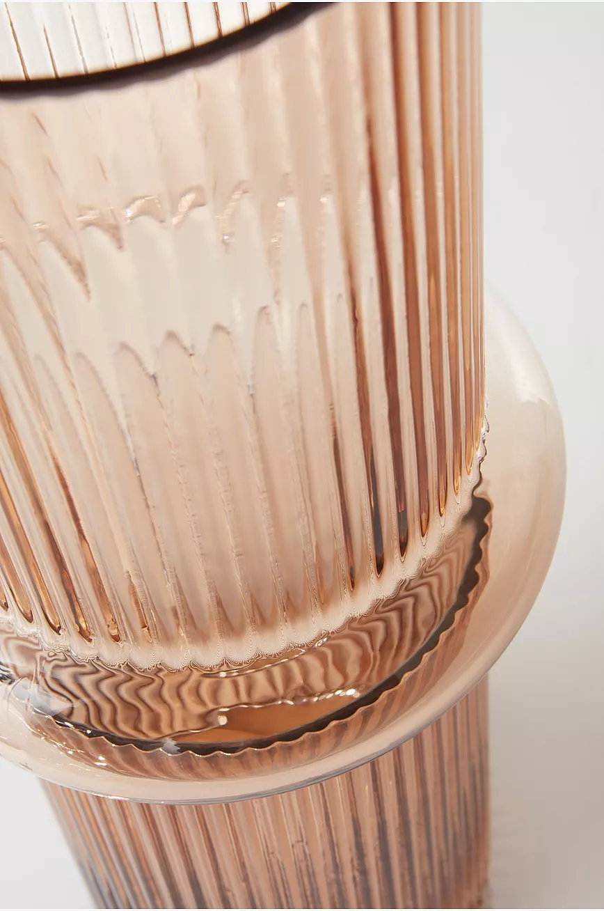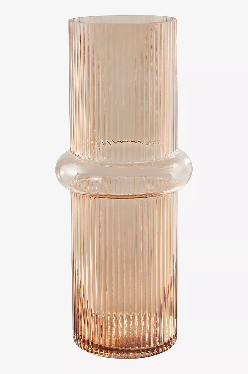 Vase av stripete glass. Vasen har pen form og stripene i glasset gir fin effekt sammen med den retroinspirerte formen. Størrelsen gjør at vasen passer til de høye, vakre snittblomstene som for eksempel liljer, roser og gladioler.