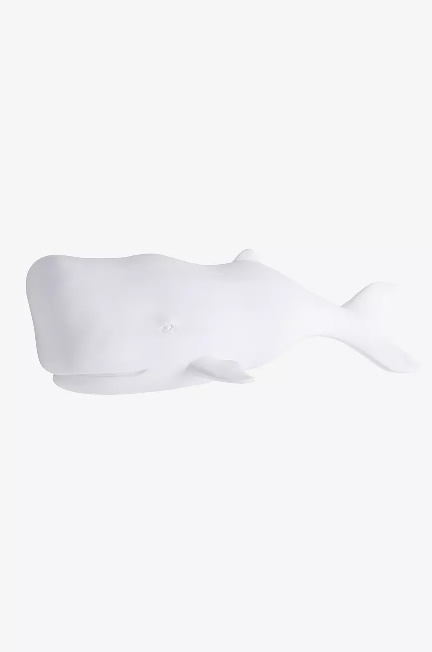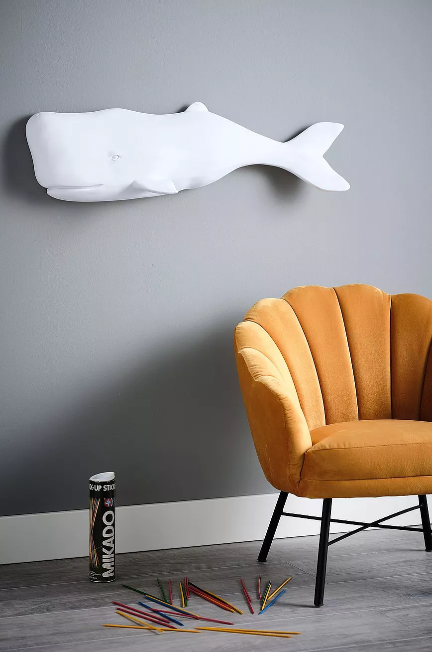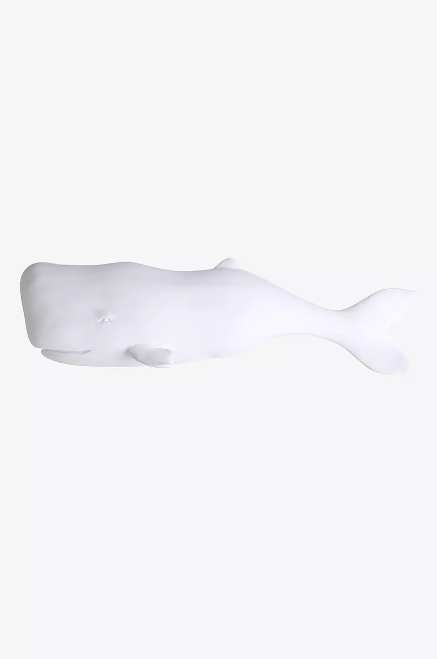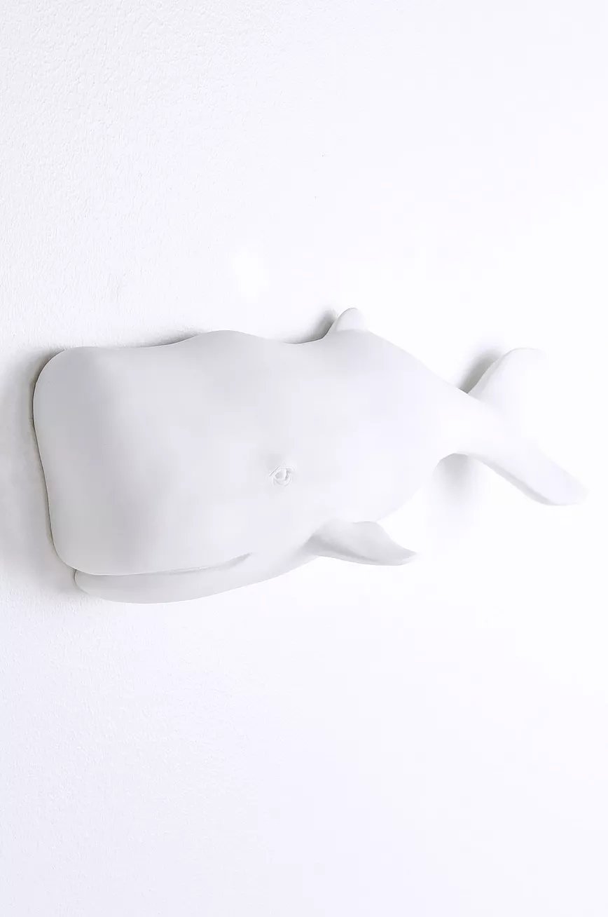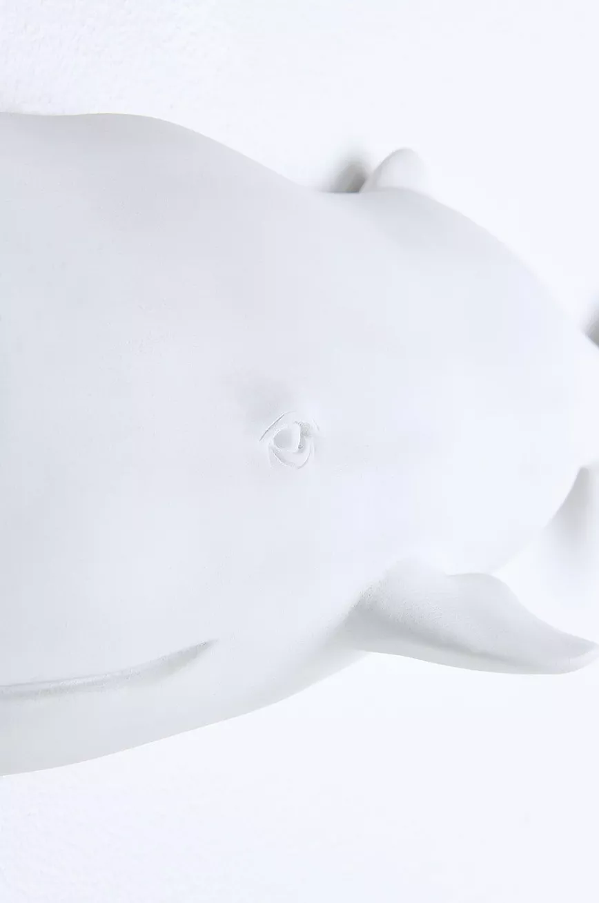 Veggdekor av polyresin i form av en fin hval med helt matt overflate. Hvalen har hull på baksiden for oppheng.