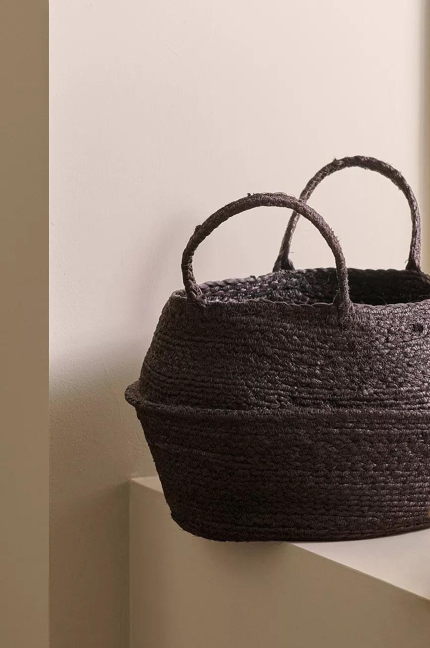 Oppbevaringskurv produsert av sjøgress med to bærehåndtak. Høyde uten håndtak 24 cm. Diameter midten 32 cm.