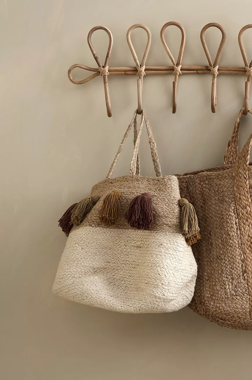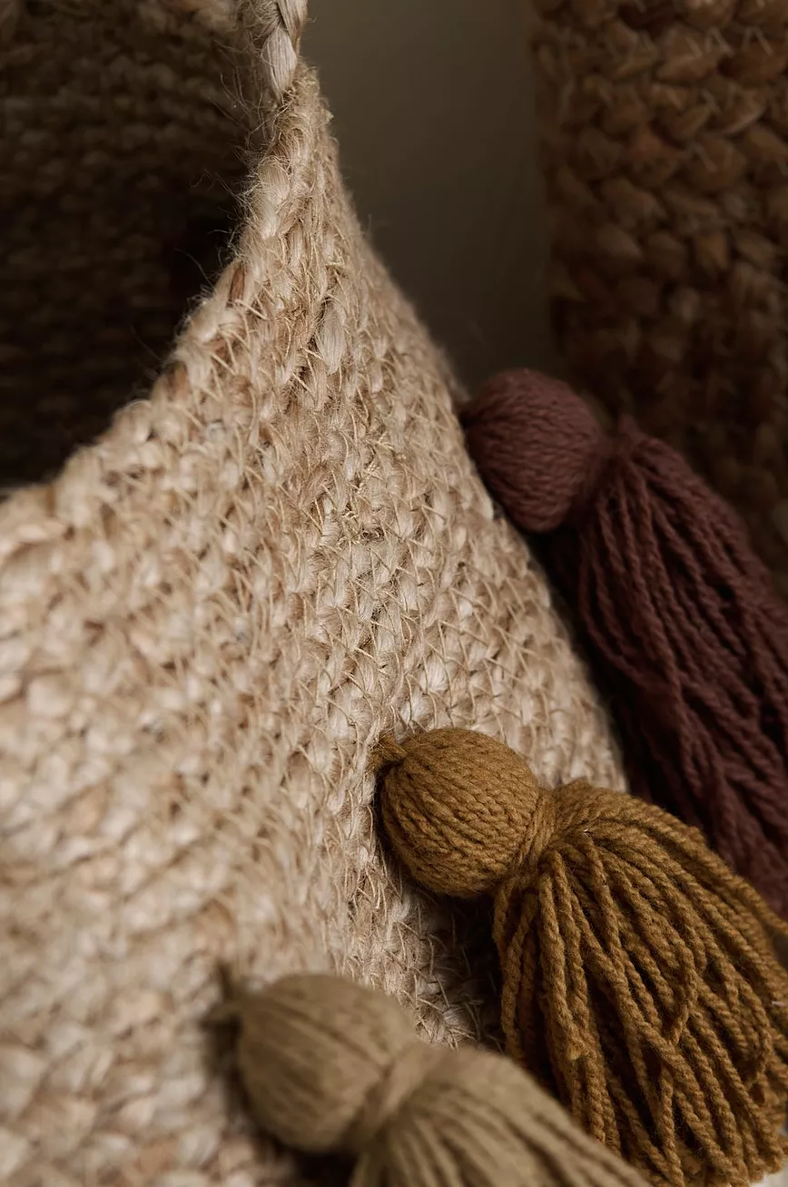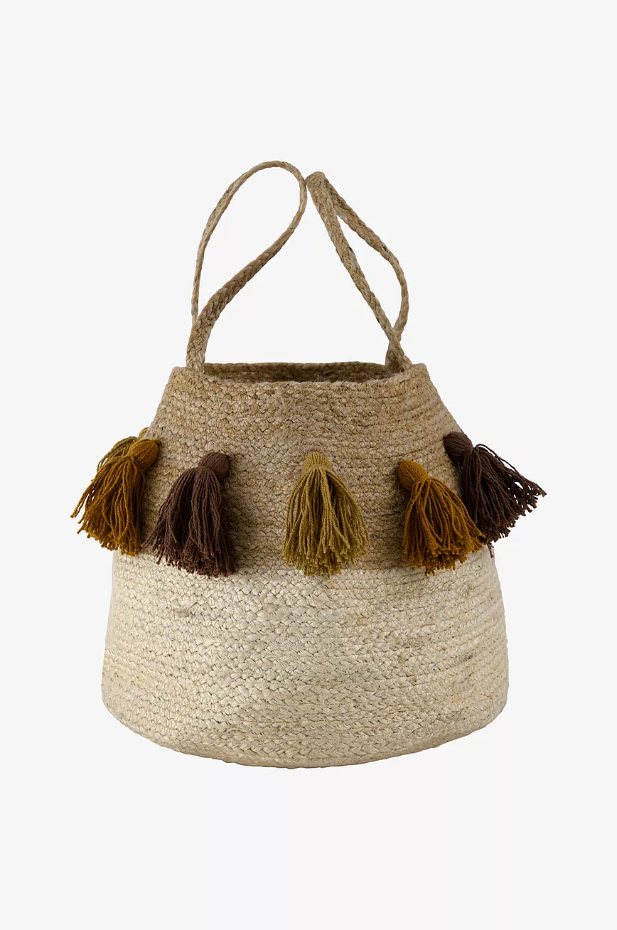 Flettet kurv i jute med påsydde dusker i bomull rundt. Kurvens høyde 33 cm. Høyde på bærehåndtakene 20 cm. Diameter nederst 36,5 cm.