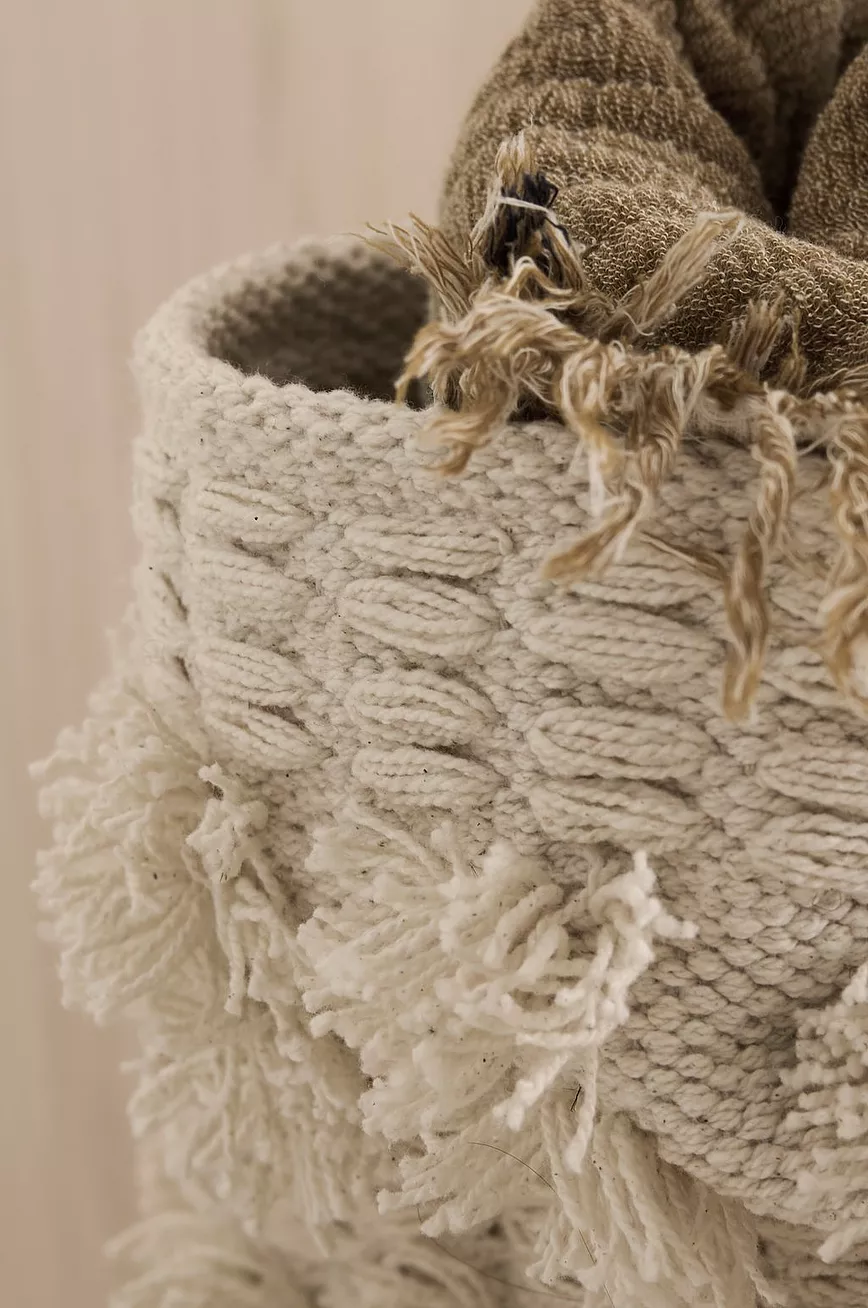 Håndlaget kurv i bomull med tuftede dusker rundt. Bunn i kraftig kvalitet.