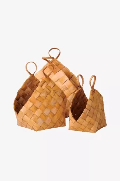 Flettede kurver i 3 deler av sypress. Mål: stor kurv 49×33, mellomste kurv 43×26 og liten kurv 37×18 cm. Høyde på alle 65 cm.
