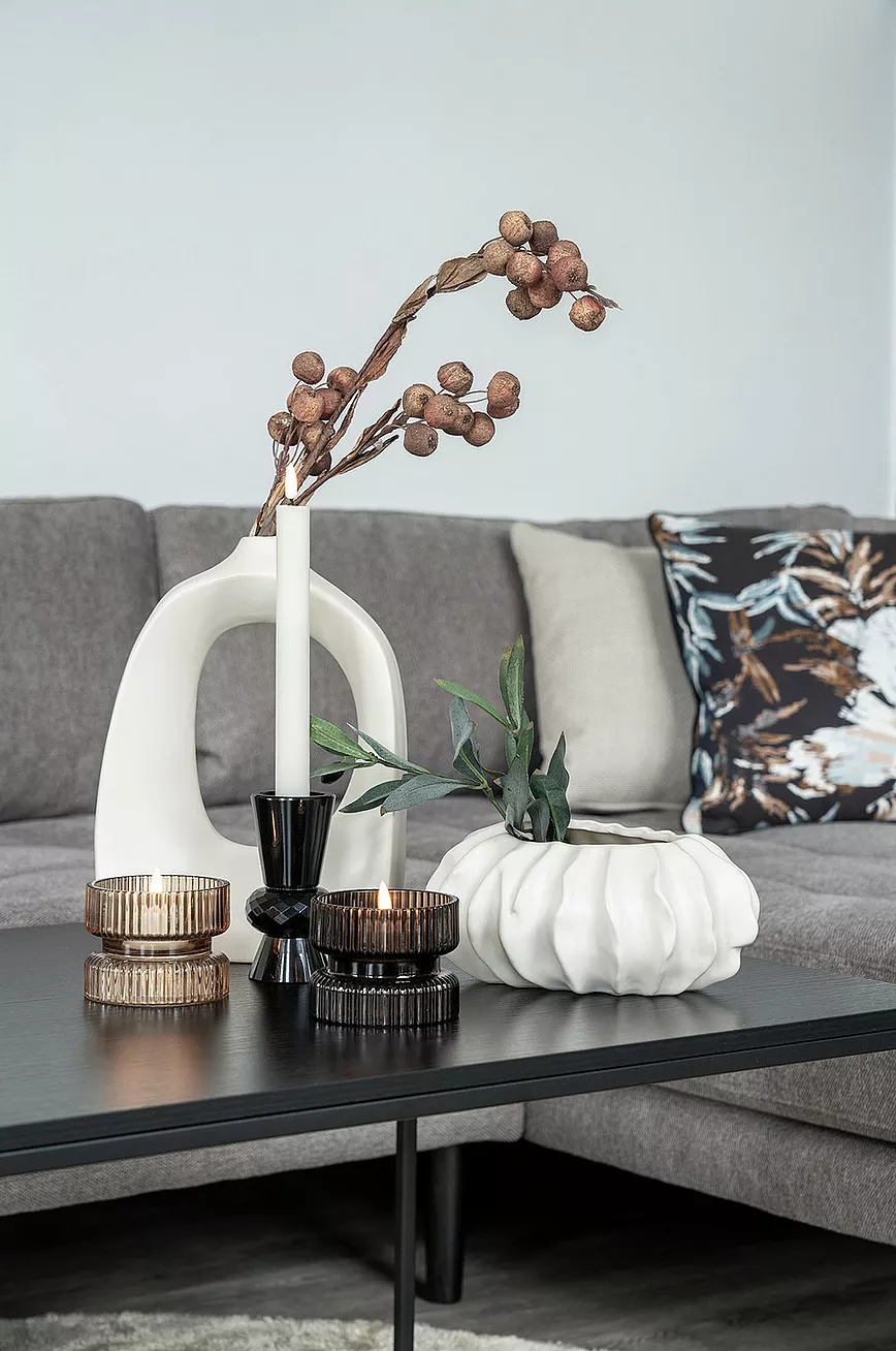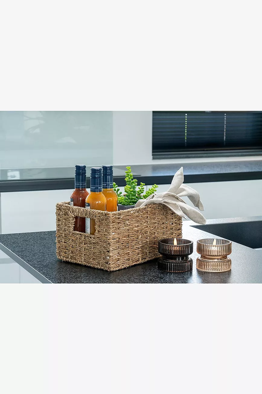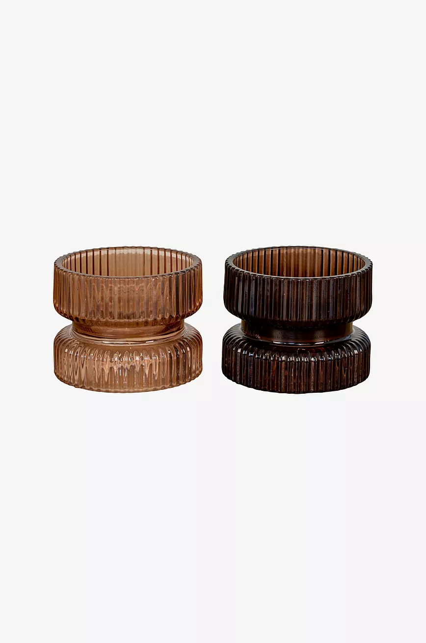 Vendbar lysholder i glass for telys og kubbelys. Mål: Diameter 9 x H 7 cm.