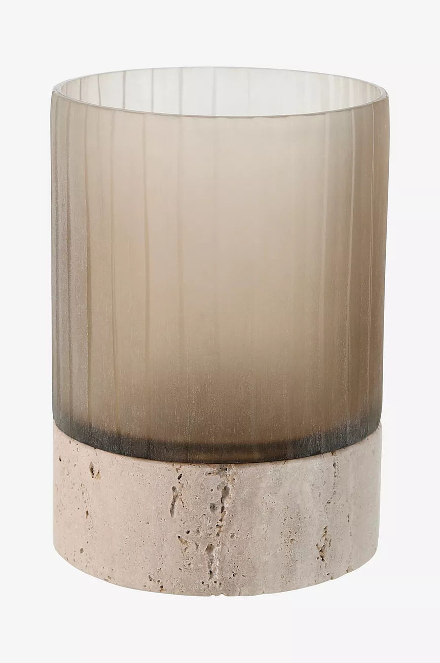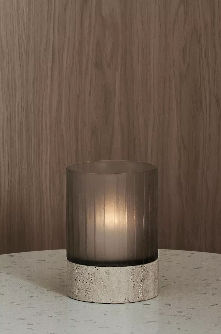 Lyslykt i 2 deler. Lykten er av glass med frostet finish, og sitter i en holder av travertin.