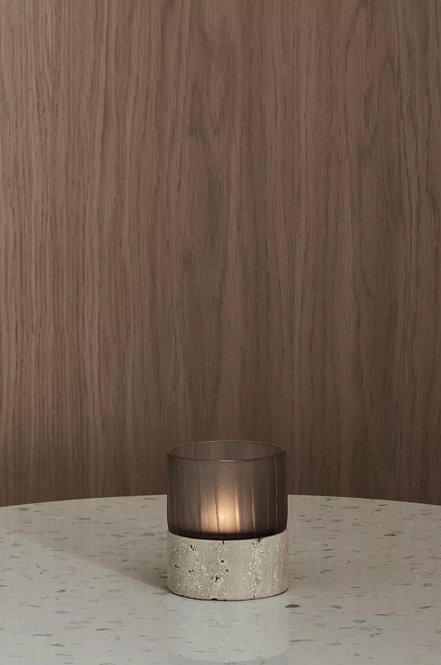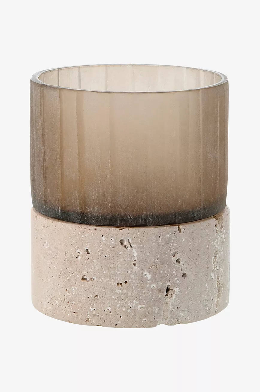 Lyslykt i 2 deler. Lykten er av glass med frostet finish, og sitter i en holder av travertin.