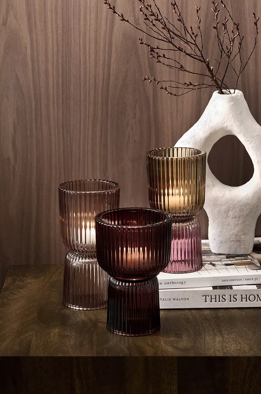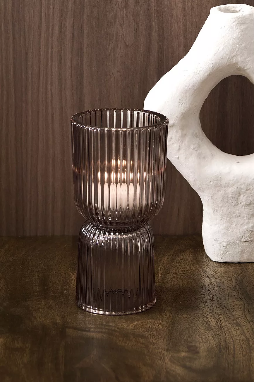 Lyslykt i glass med rillet teksturmønster. Diameter øverst 9 cm, diameter nederst 7,5 cm.