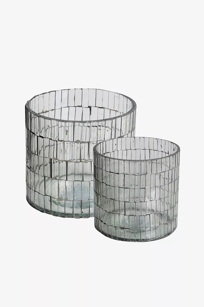 Koselig sett med lyslykter i glassmosaikk. Glasset er munnblåst og derfor er hver lykt unik. Luftbobler og ujevnheter i glasset kan forekomme, noe som gjør det litt ekstra personlig. Liten lykt D 10 cm x H 11 cm. Stor lykt D 12 cm x H12 cm.