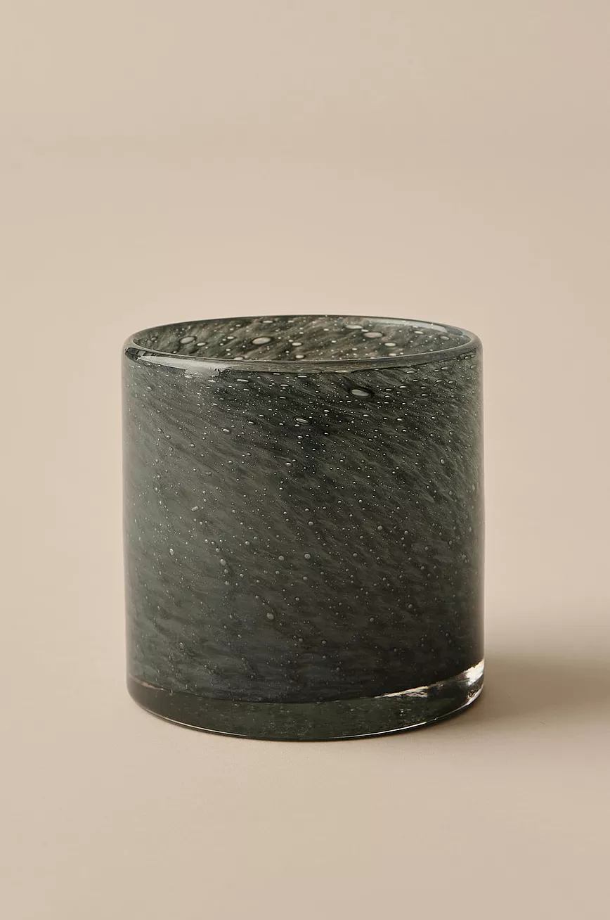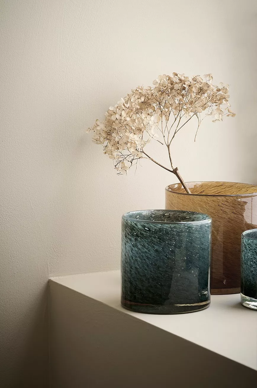 Lyslykt eller liten krukke i glass. Fargen har vakre skiftninger og glasset har bobler i seg som skaper et fint uttrykk og et stemningsfullt skinn. Teknikken gjør at ujevnheter og fargeforskjeller forekommer og hver lyslykt blir unik. Høyde ca. 12 cm, Ø ca. 12 cm. Rengjøres for hånd.