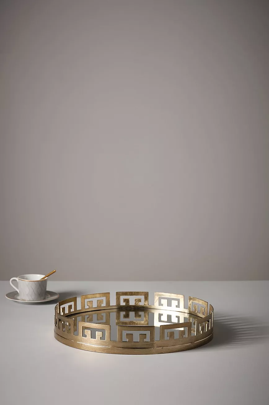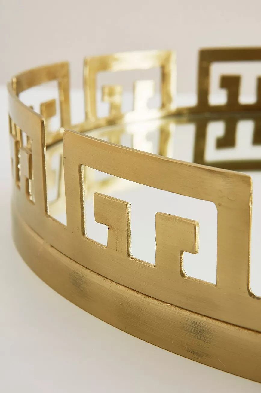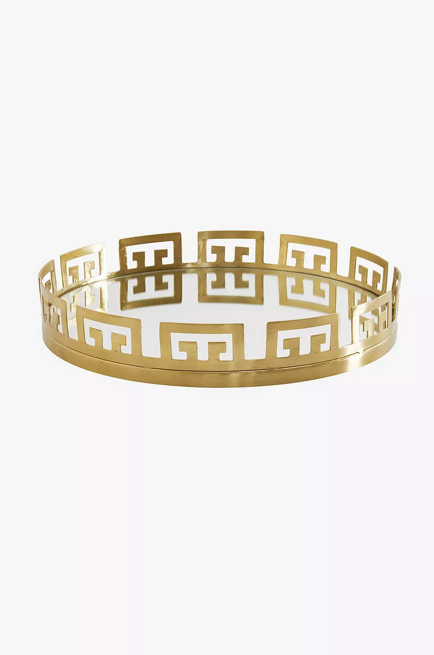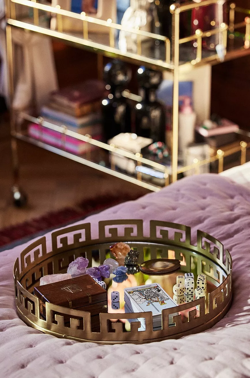 Et elegant brett med speil i bunnen skaper en luksuriøs følelse i rommet.