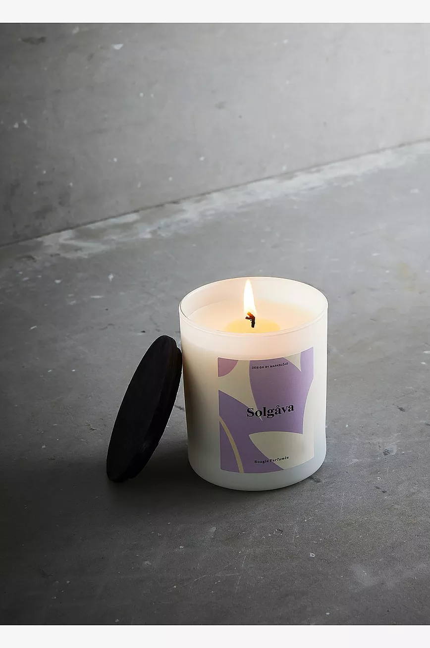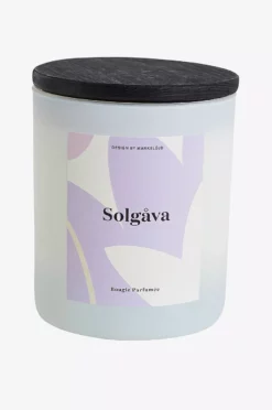 Duftlys av soyavoks. Duft: «En spasertur på en sommereng i skumringen. Etter en varm dag svalner kvelden og lokker frem duften fra alle utsprungne blomster. Grensen mellom drøm og virkelighet viskes sakte ut. Det er duften av Solgåva.» Fremstilt i Spania. Vekt 230 g. Brennetid 50 t.