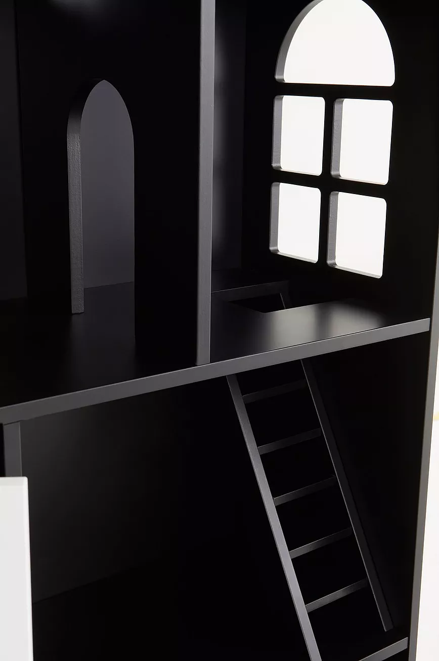 Størrelse: Høyde 105,5 cm, bredde 61 cm, dybde 28 cm. Høyde nederste etasje 15,4 cm. Høyde etasjer 30 cm. Høyde loftsetasje 12 cm.