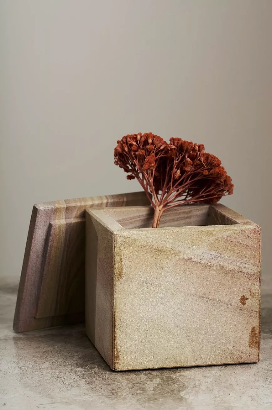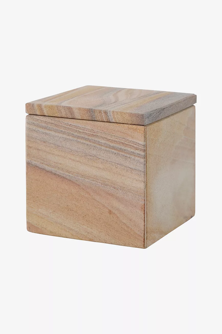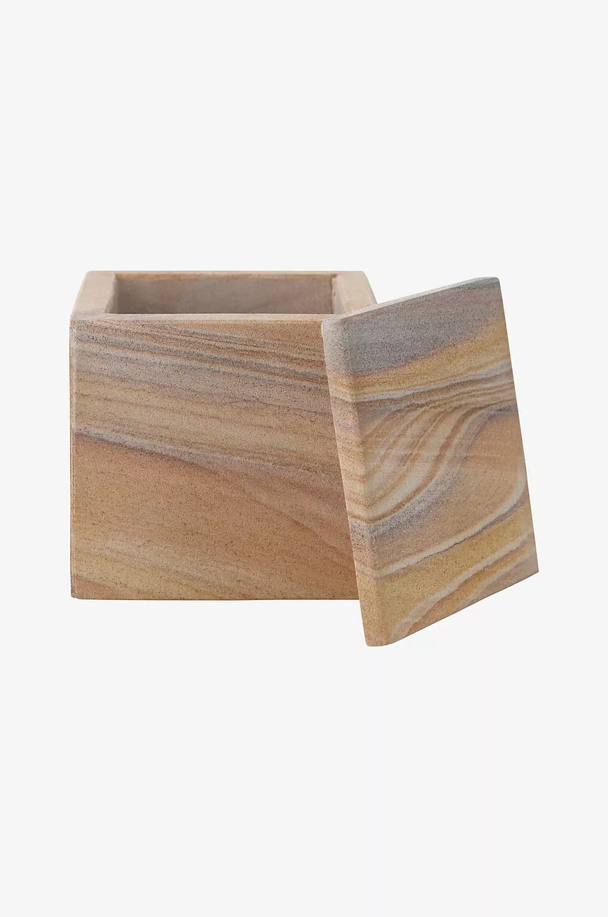 Liten eske til oppbevaring. Av sandstein med lokk.