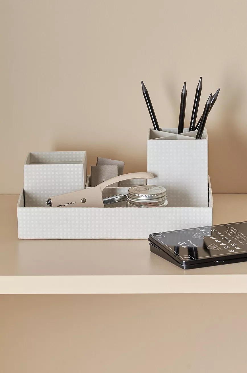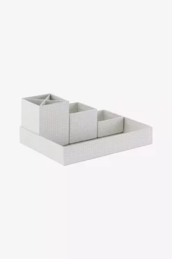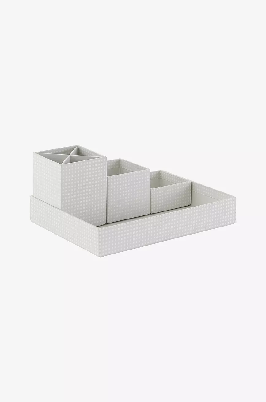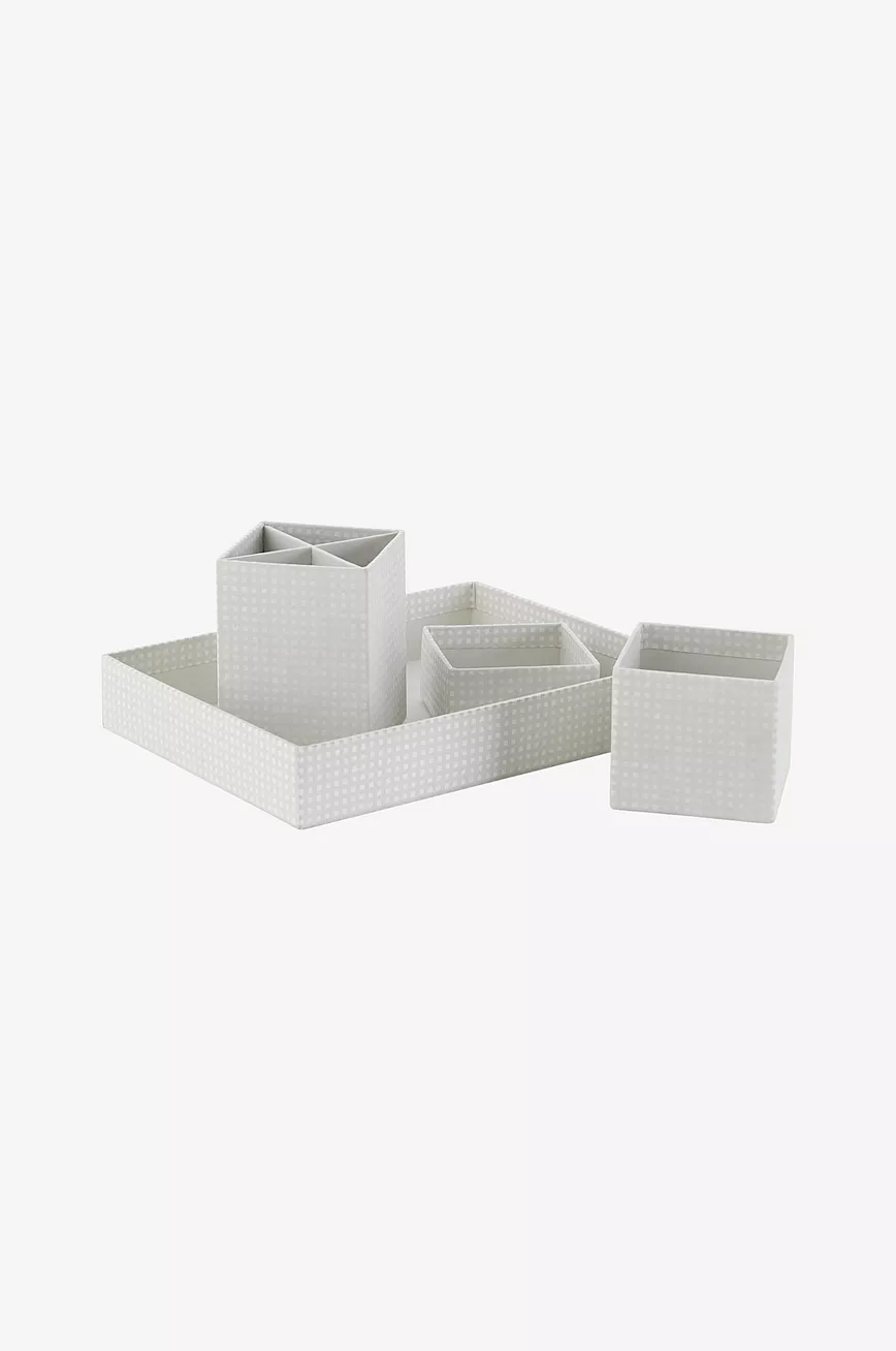 Oppbevaringssett i 4 deler av gjenvunnet, håndlaget papir/kartong. Settet består av penneholder, to små bokser samt et brett.