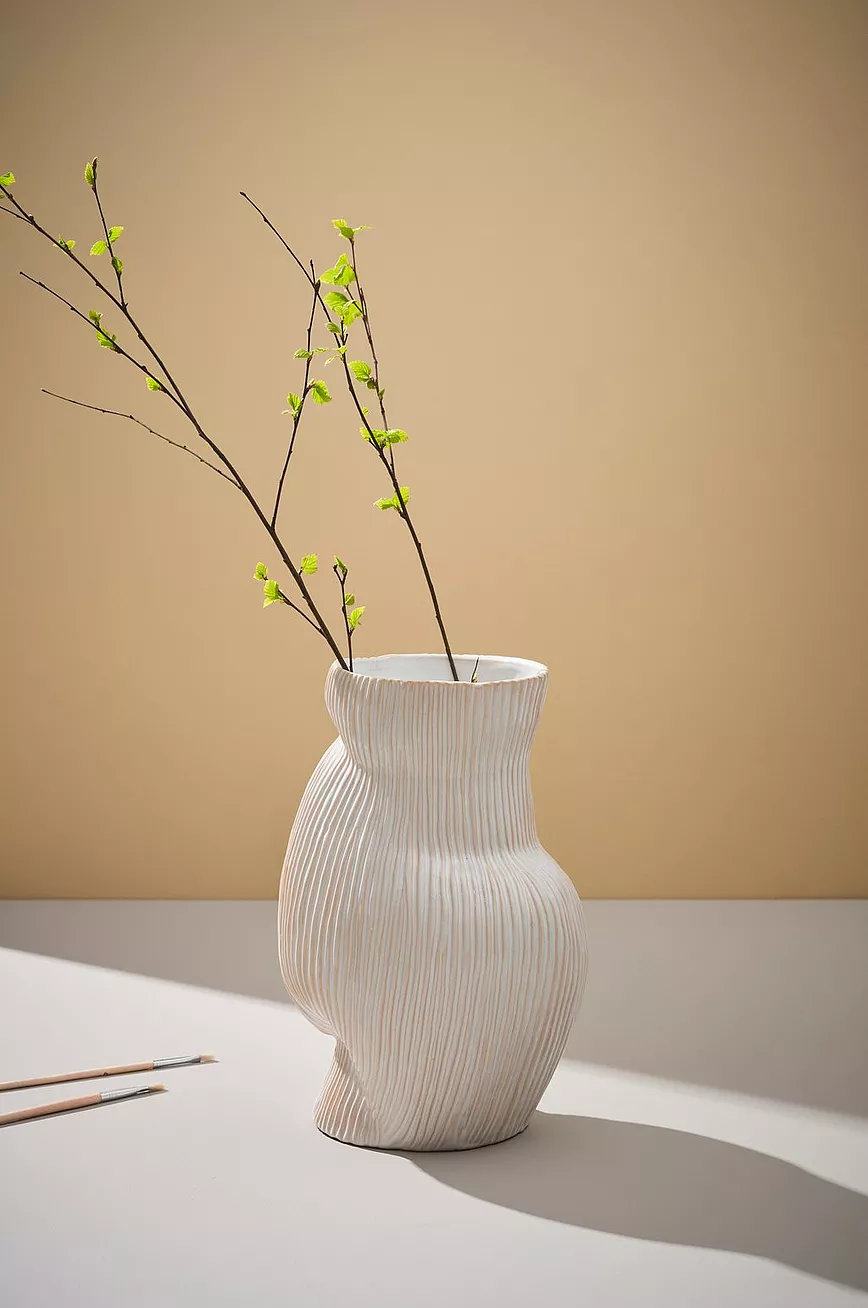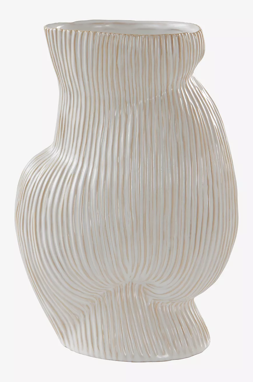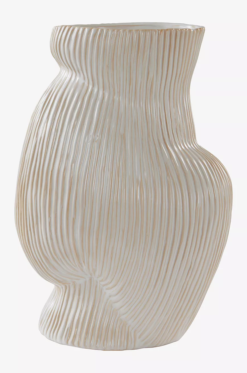 Håndlaget dekorvase av keramikk. En stilren vase med spennende fasong og riflete overflate. Innsiden er også glasert. Et visst avvik kan forekomme ettersom vasen er håndlaget. Keramikk kan slippe gjennom fukt.
