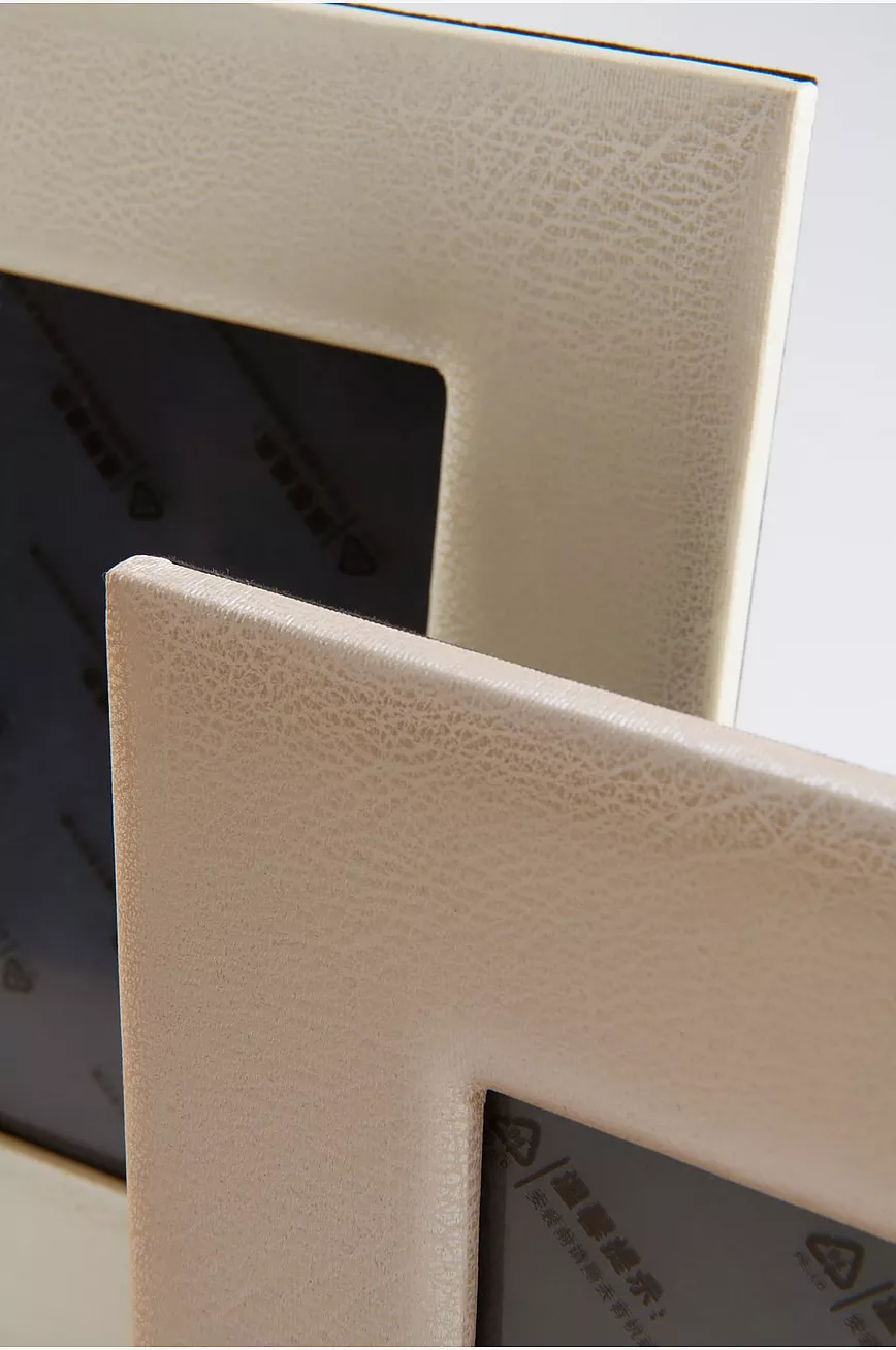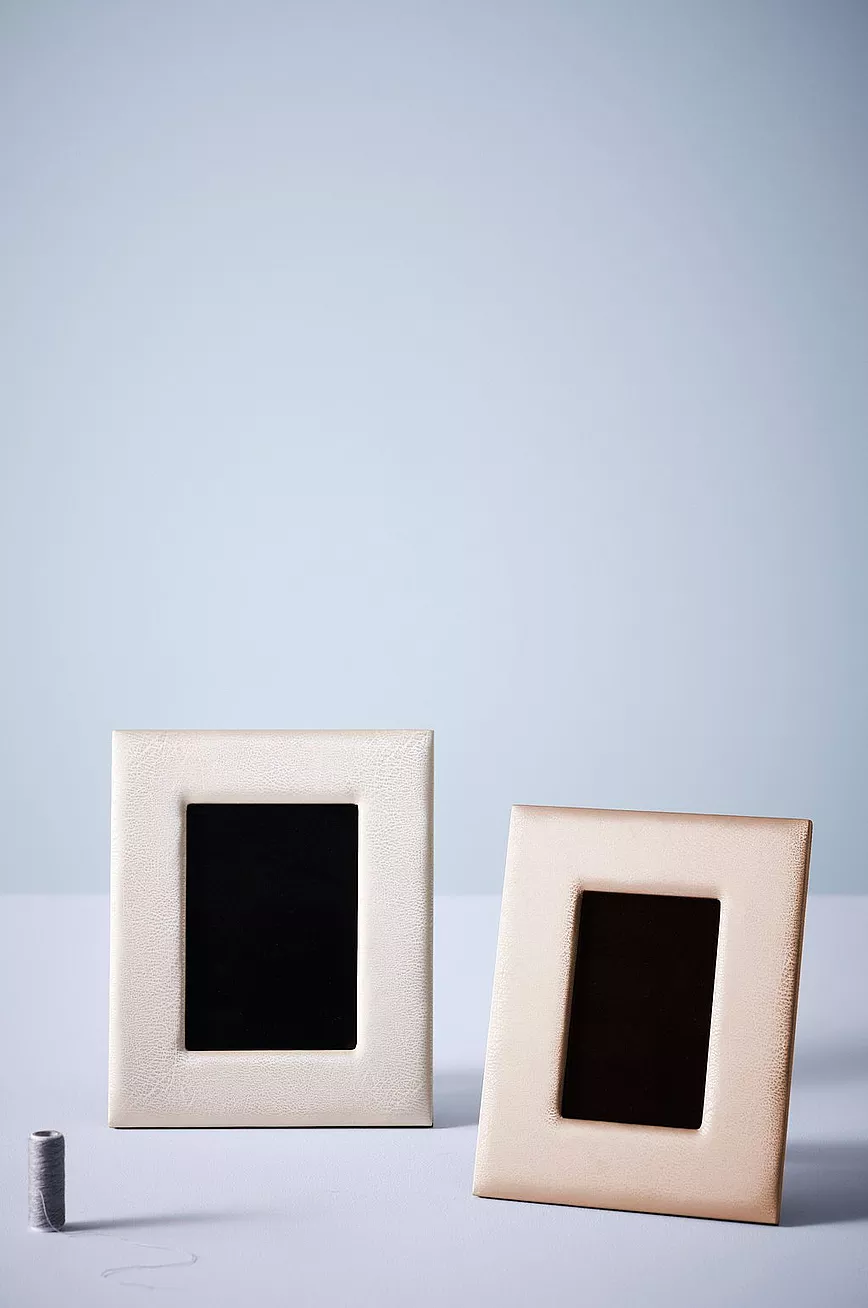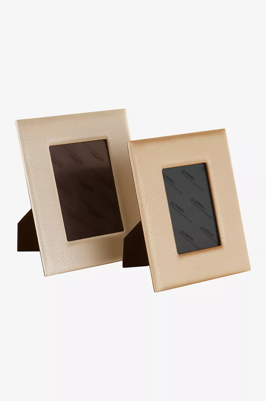 To rammer i MDF med dekorativ kant kledd i fuskeskinn. Rammene har støtte på baksiden slik at du enkelt kan plassere de på et bord.