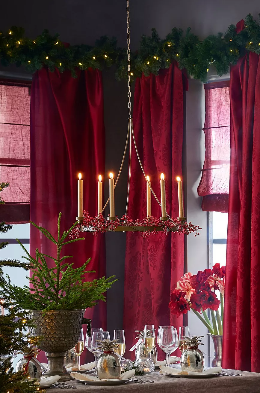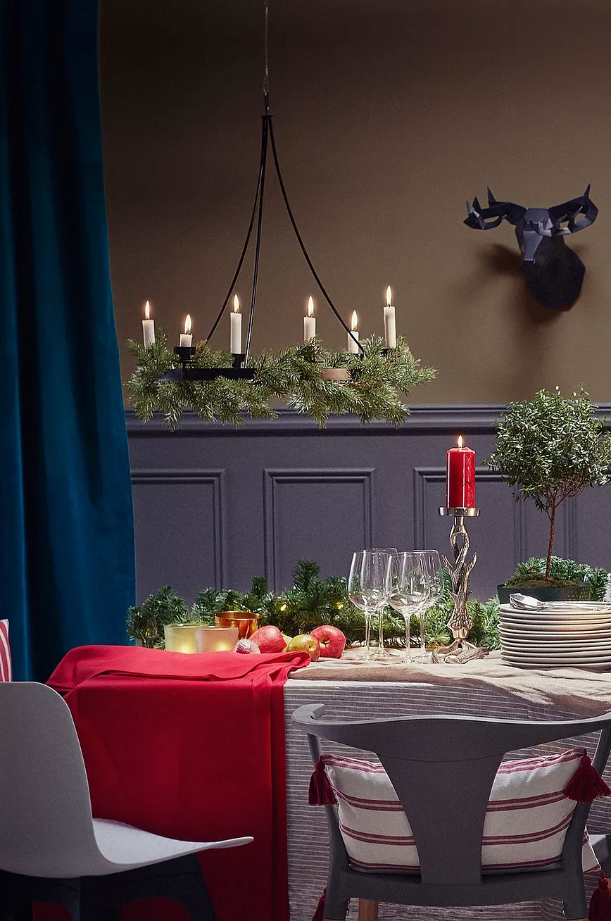 Stilren taklysekrone som lyser opp din spisestue. Med enkle grep blir den ekstra dekorativ til årets ulike middager, granbar til jul, blomster til sommeren eller eucalyptuskvister som er fine året rundt.