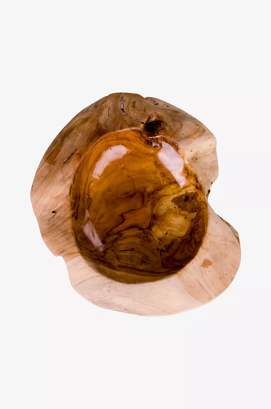 Skål i teak. Hver skål er unik, det vil si at ingen er helt like. Mål: Bredde: 40 cm. Lengde: 40 cm. Høyde: 12 cm. Materiale: Teak. Montert.