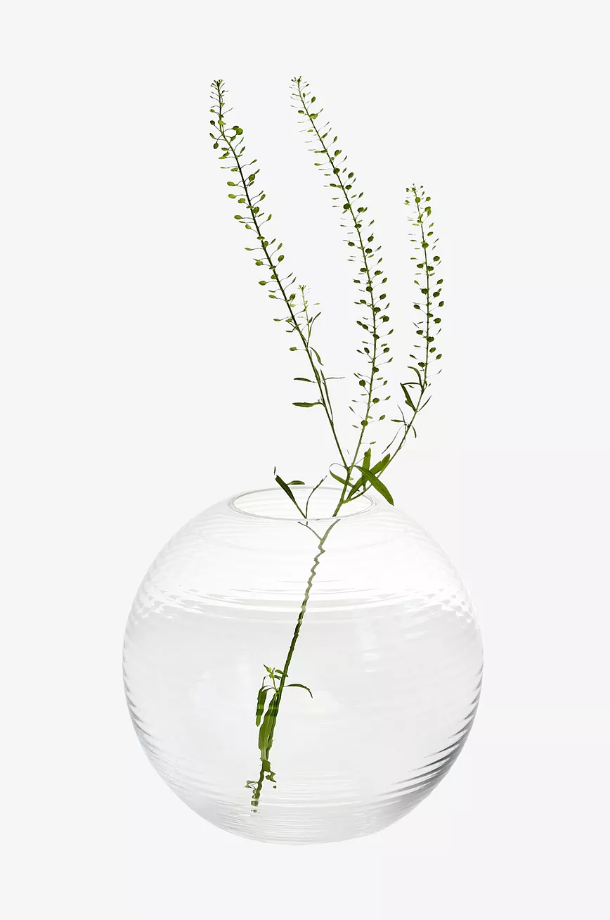 Laine er en vakker og dekorativ vase, formet i en enkel og grasiøs design. Vasen er full av vakre detaljer, og når du kommer nært kan du se de fine rillene på innsiden av vasen som minner om ringer i vann. Det finnes ingenting bedre enn fargeglade blomster. Sett vasen på sofabordet eller vinduskarmen, og dekorer den med en vakker blomsterbukett for å løfte humøret. Høyde: 14 cm. Diameter: 15 cm. Materiale: munnblåst glass.