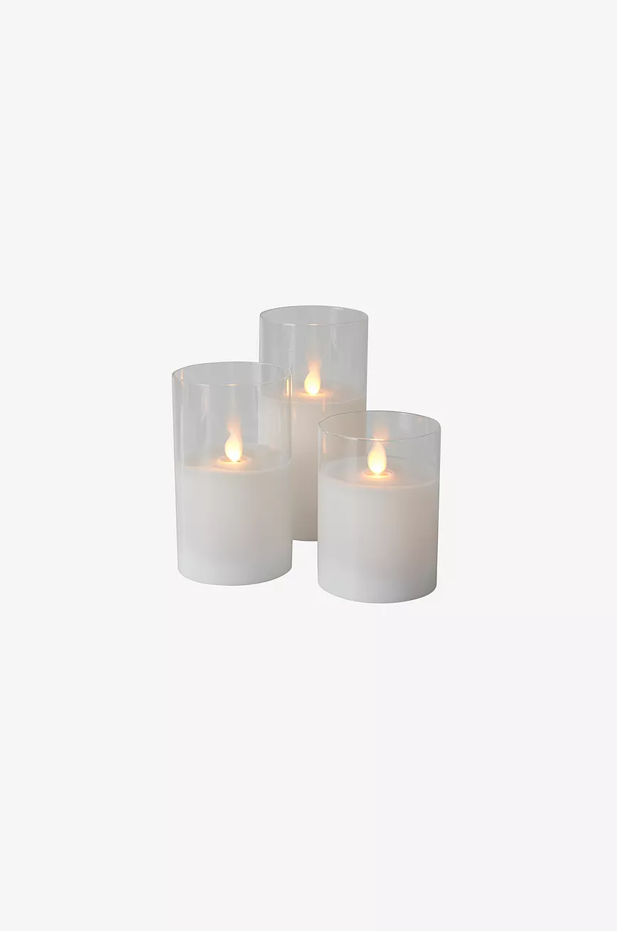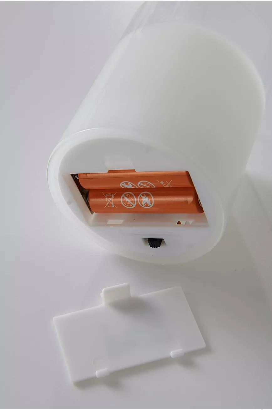 LED-kubbelys i voks med glass rundt. Lyset har en innebygd, repeterende timer som er på i 6 timer og av i 18 timer. Drives med 2 stk AA-batteri. Batteri er ikke inkludert.