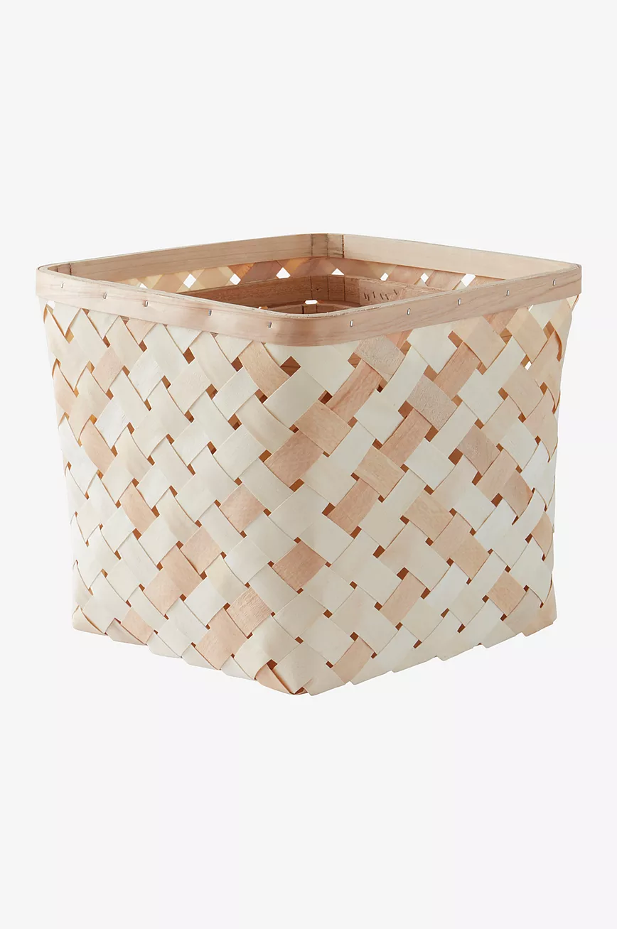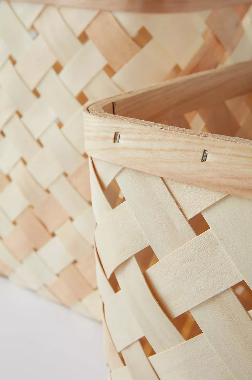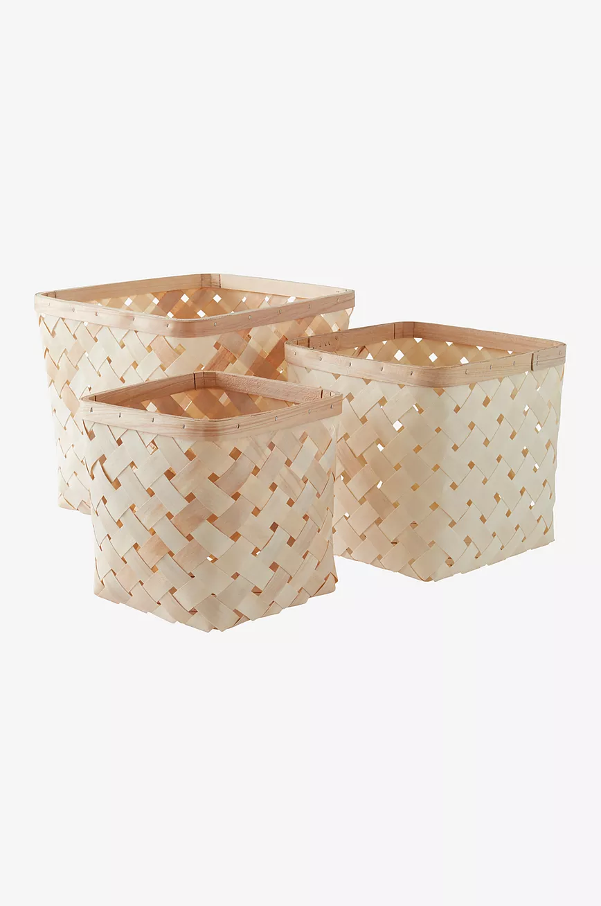 3-pk kurver av tre. De firkantede kurvene er i ulike størrelser og formet som klassiske, flettede sponkurver med stabil kant øverst.