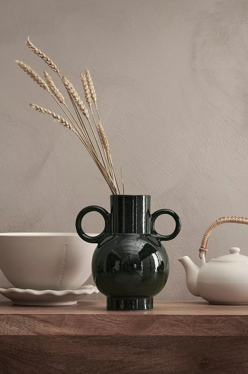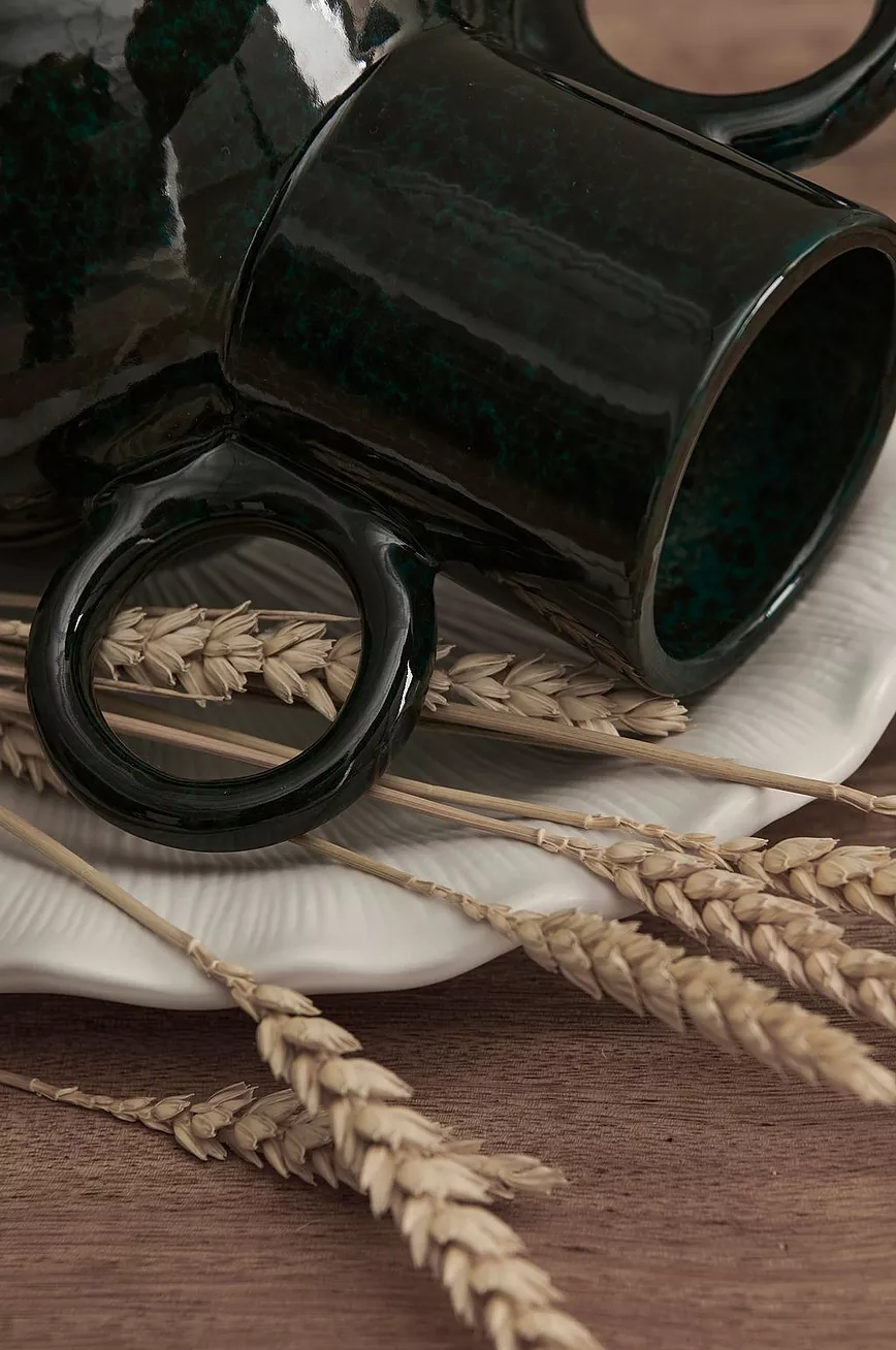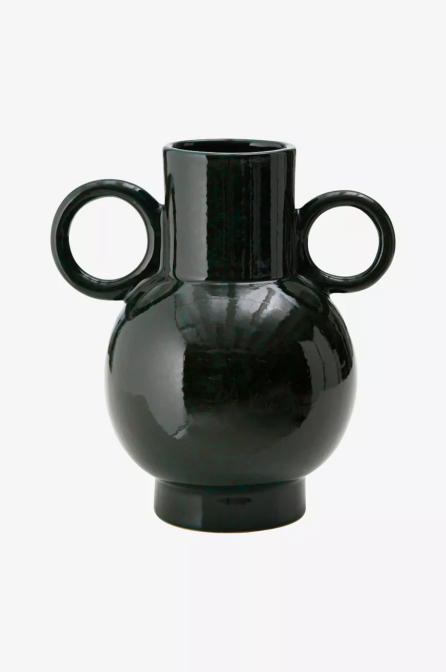 Vase / mugge av glasert steintøy med håndtak. Høyde ca. 21 cm. Diameter øverst 7,5 cm (innvendig mål 6,5 cm). Diameter på det bredeste ca. 20 cm inklusive håndtak. Rengjøres for hånd.
