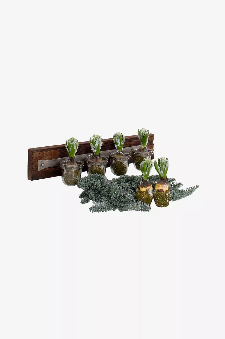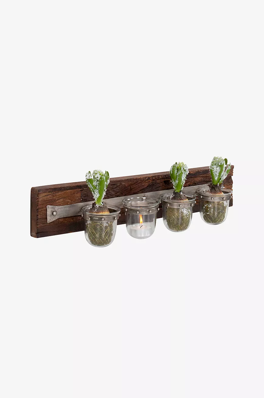 Lysholder til vegg i gjenvunnet tre med 4 lysholdere i jern med glasskupler.