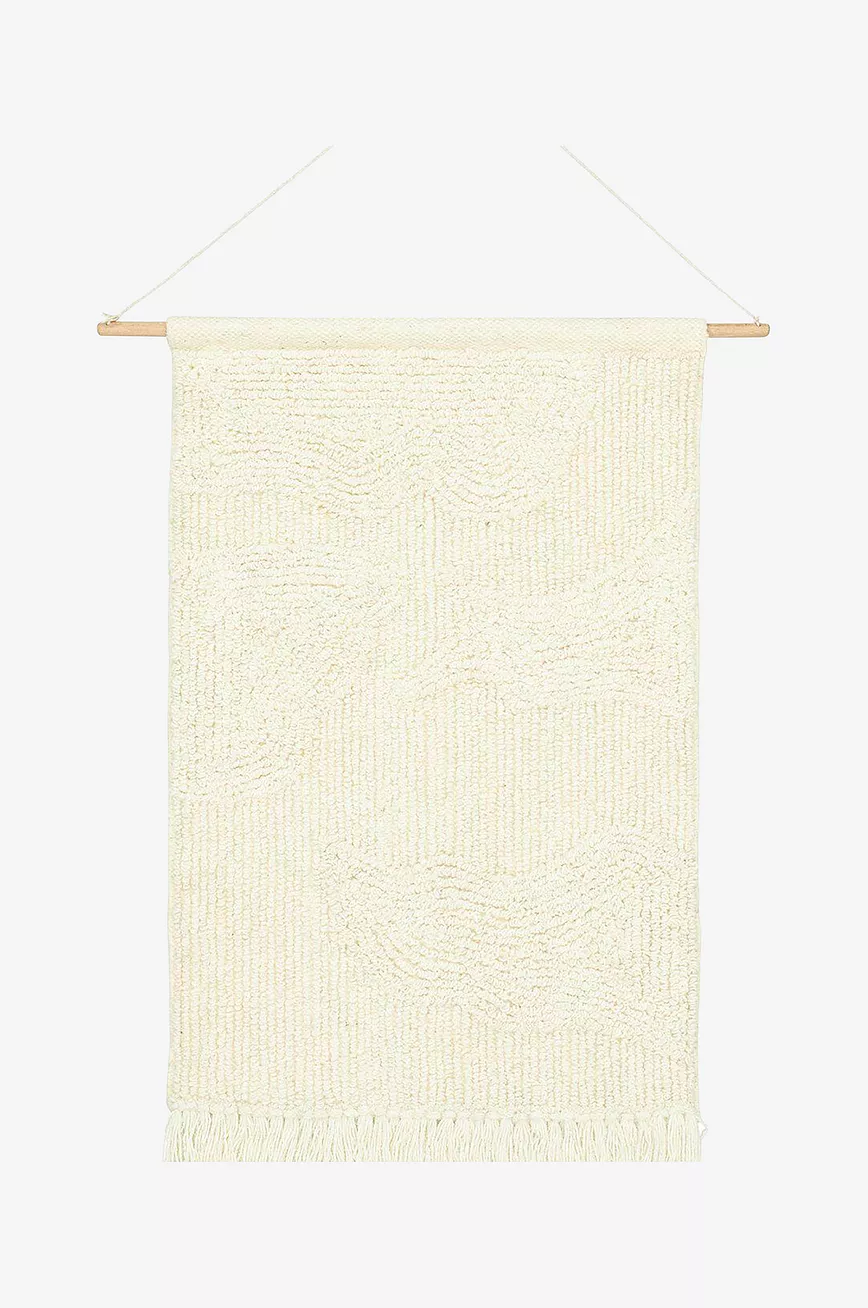 Håndvevd veggteppe / gobeleng med tuftet mønster i ull. Kommer med trepinne og bånd for enkelt oppheng. 100% ull.