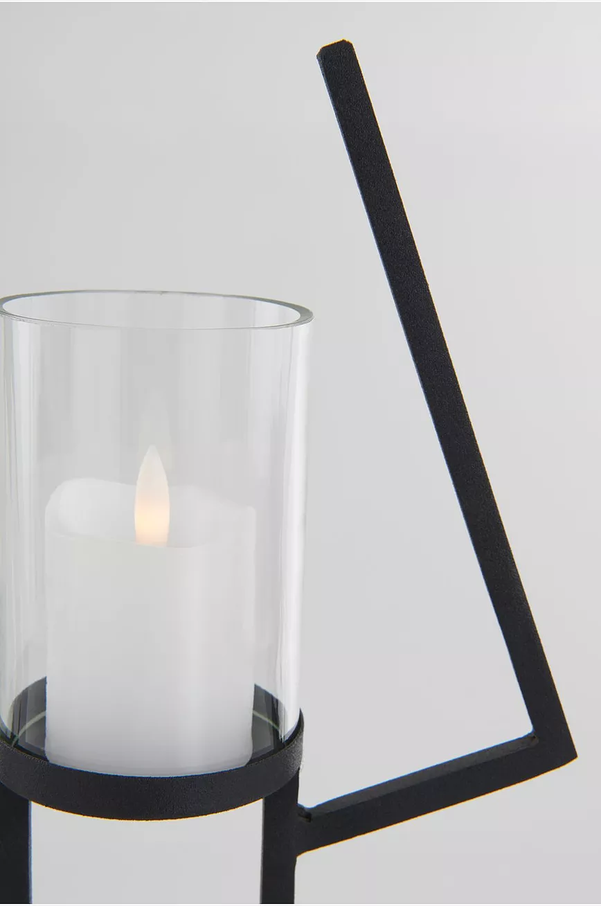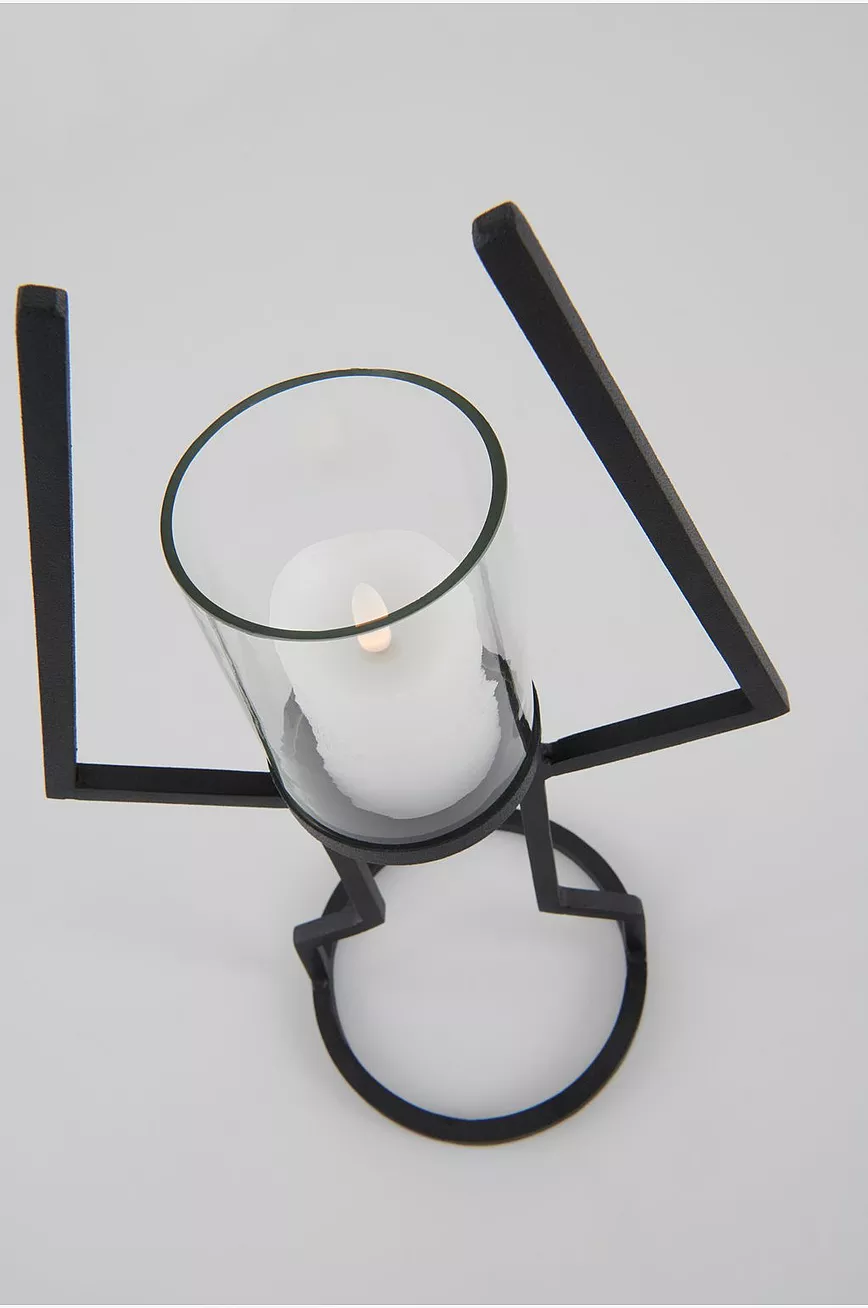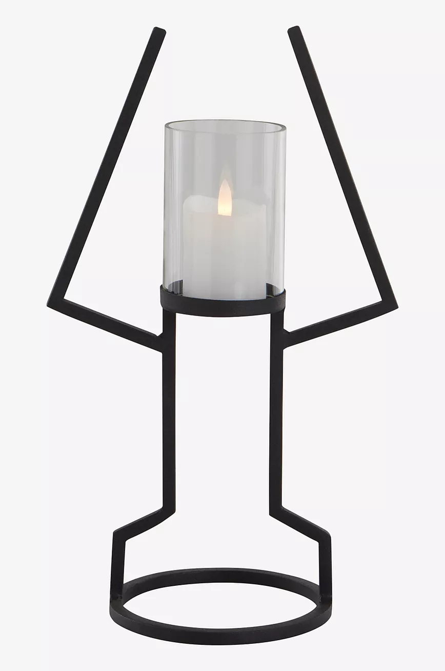 Lysestake av jern med lysholder av glass. Lysestaken er unik, og har et unikt design med dekorative detaljer som skiller seg ut. Lys medfølger ikke.